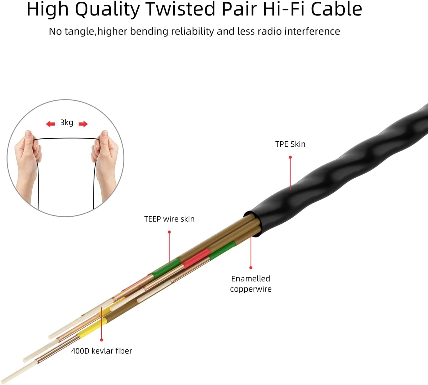 - High Quality Twisted Pair Hi-Fi Cable:The twisted core cable not only improves durability, reduces tangle and rejects noise from RF interference, but also obtain high-resolution sound.