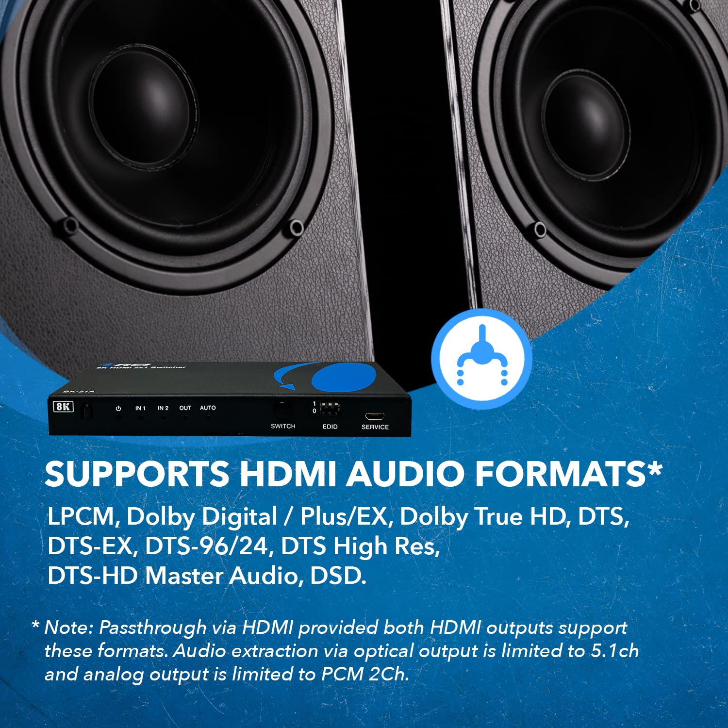 - Audio Extraction: Features audio extraction through optical and L/R ports. HDMI audio formats supported: LPCM, Dolby Digital/Plus/EX, Dolby True HD, DTS, DTS-EX, DTS-96/24, DTS High Res, DTS-HD Master Audio, DSD.This device does not support CEC