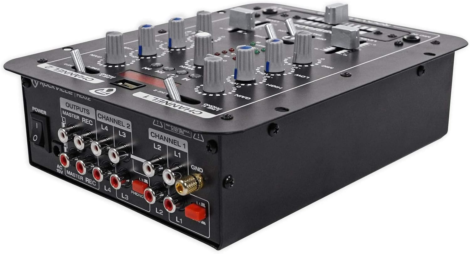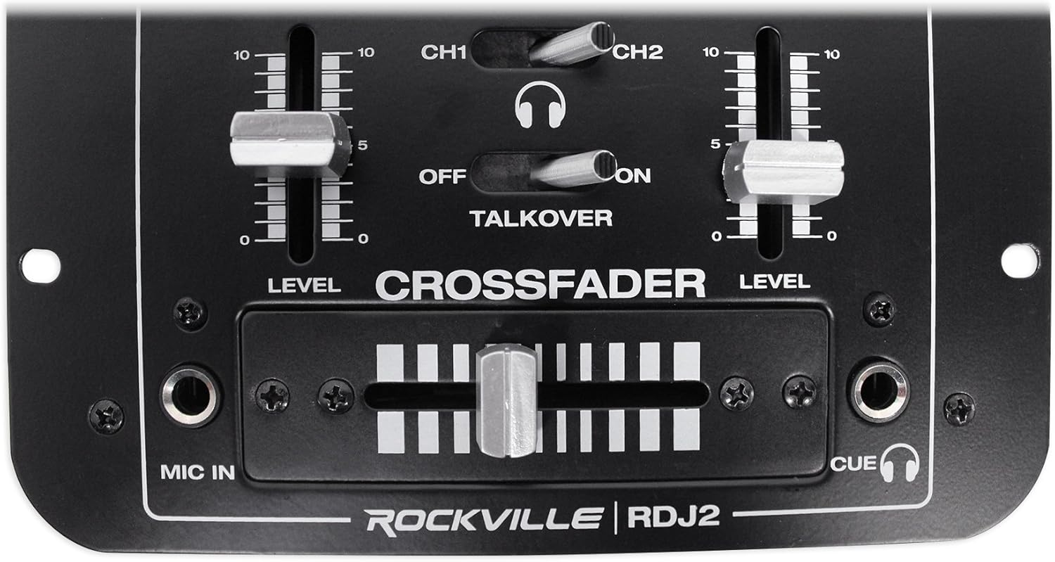Rockville RDJ2 2-Channel DJ Mixer USB Playback, Cue Monitor, Talkover, 4 Line Inputs, Compact, Portable, for Beginner DJs and Small Events