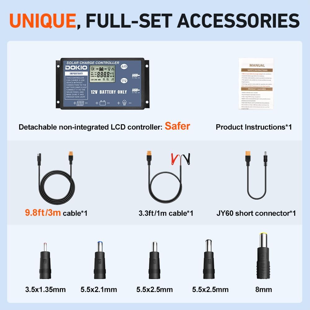 - 【ALL-IN-ONE KIT, READY TO GO】 Includes 200W foldable panel, standalone controller, SAE/XT60/alligator clips, 4 DC adapters (3.5×1.35mm / 5.5×2.1mm / 5.5×2.5mm / 8.0mm), 9.8ft cable, storage bag, and manual—everything you need for quick setup out of the box.