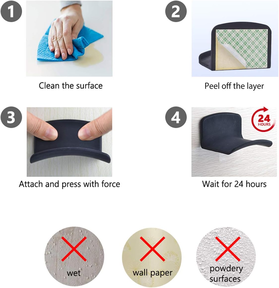 - 【User Tips】 (1) Clean surface well using provided wipes before attaching. (2) Allow adhesive to set for 24 hours before using holder. (3) Not suitable for use on wet, greasy or dusty surfaces or on walls with wallpaper.