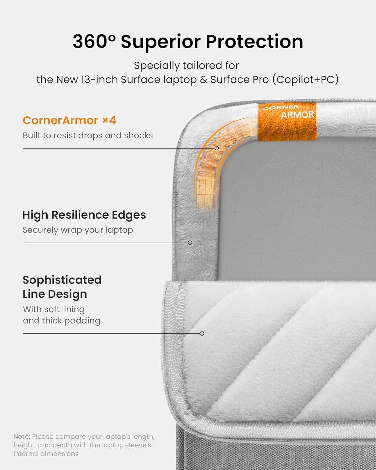 - Warranty & Compatibility: You can get a 12-month worry-free warranty, friendly and timely customer support, and a laptop sleeve perfectly fits: Microsoft 13-inch New Surface Laptop, Copilot+PC 2025, 13-inch New Surface Pro 11th, Copilot PC 2024 with Flex Keyboard, Surface Pro 10/9/8/X with Signature Keyboard/X Keyboard, 12.4-inch Surface Laptop Go; Internal Dimensions - 11.97" x 8.46" x 0.61", Front Pocket: 9.45" x 7.68"