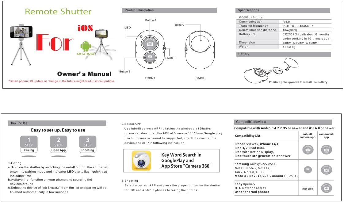 - How to Connect the Remote: 1, Turn on the Remote by side button, the small led will flash. 2, Find bluetooth function page of your phone, turn bluetooth function on and source " AB Shutter3", pair it, and the remote will work.