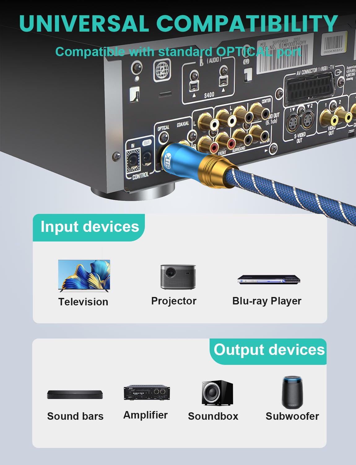- ✅UNIVERSAL COMPATIBILITY:EMK fiber optic audio cable is adaptable and can connect to various soundbars and home theatres for increased sound clarity with TVs, PS4, Xbox, Blu-Ray players, and more. Stable and reliable with a heat-resistant optical fiber core, this premium TV optical cable can transmit signals without any electromagnetic or radio frequency interference.