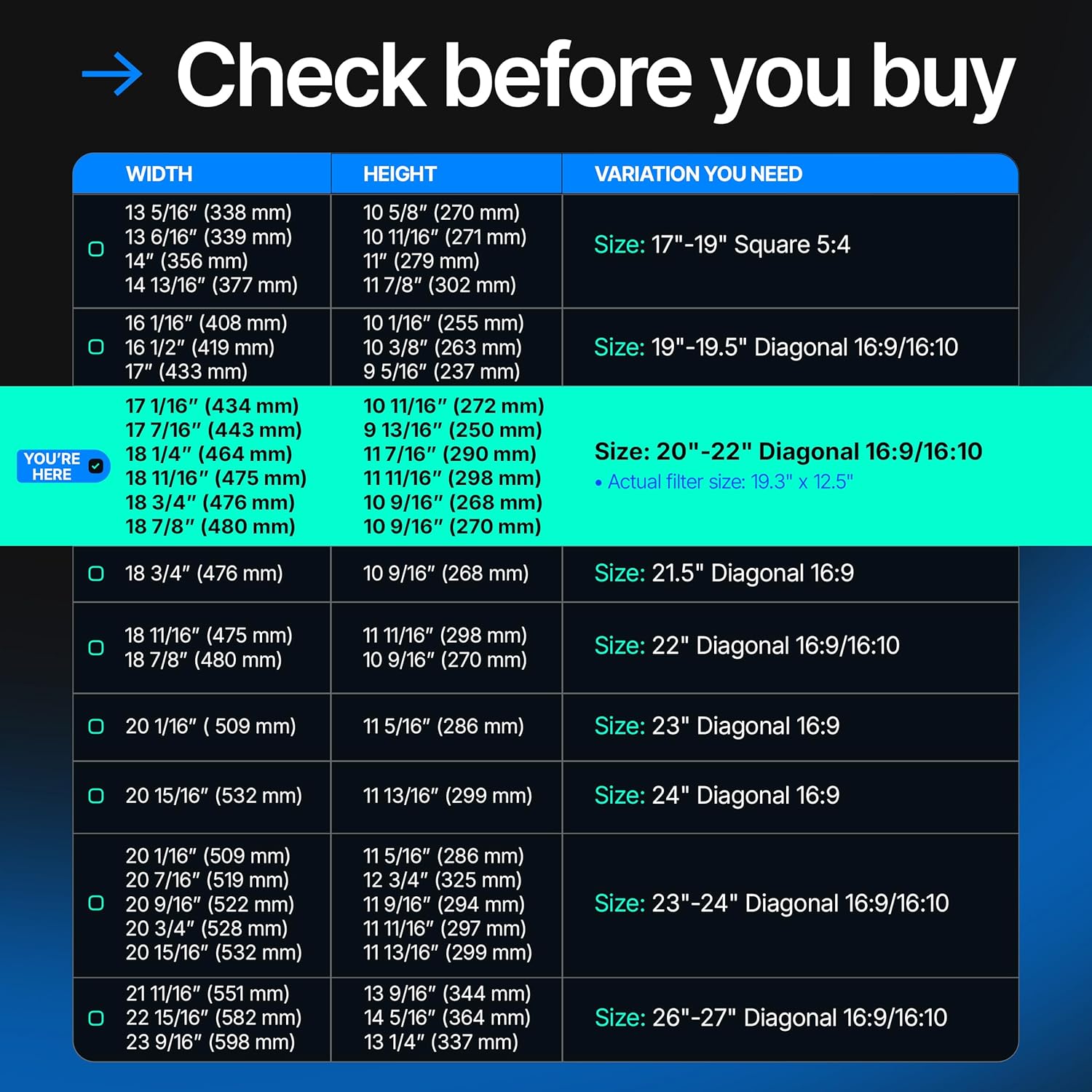 - Ideal Fit: Privacy screen protector fits screens sizes of 20", 20.2", 21.5", 21.6", 22". Actual filter size: Width: 19.4 inches (492mm), Height: 12.6 inches (319mm). The filter enhances visual clarity and protects the eyes