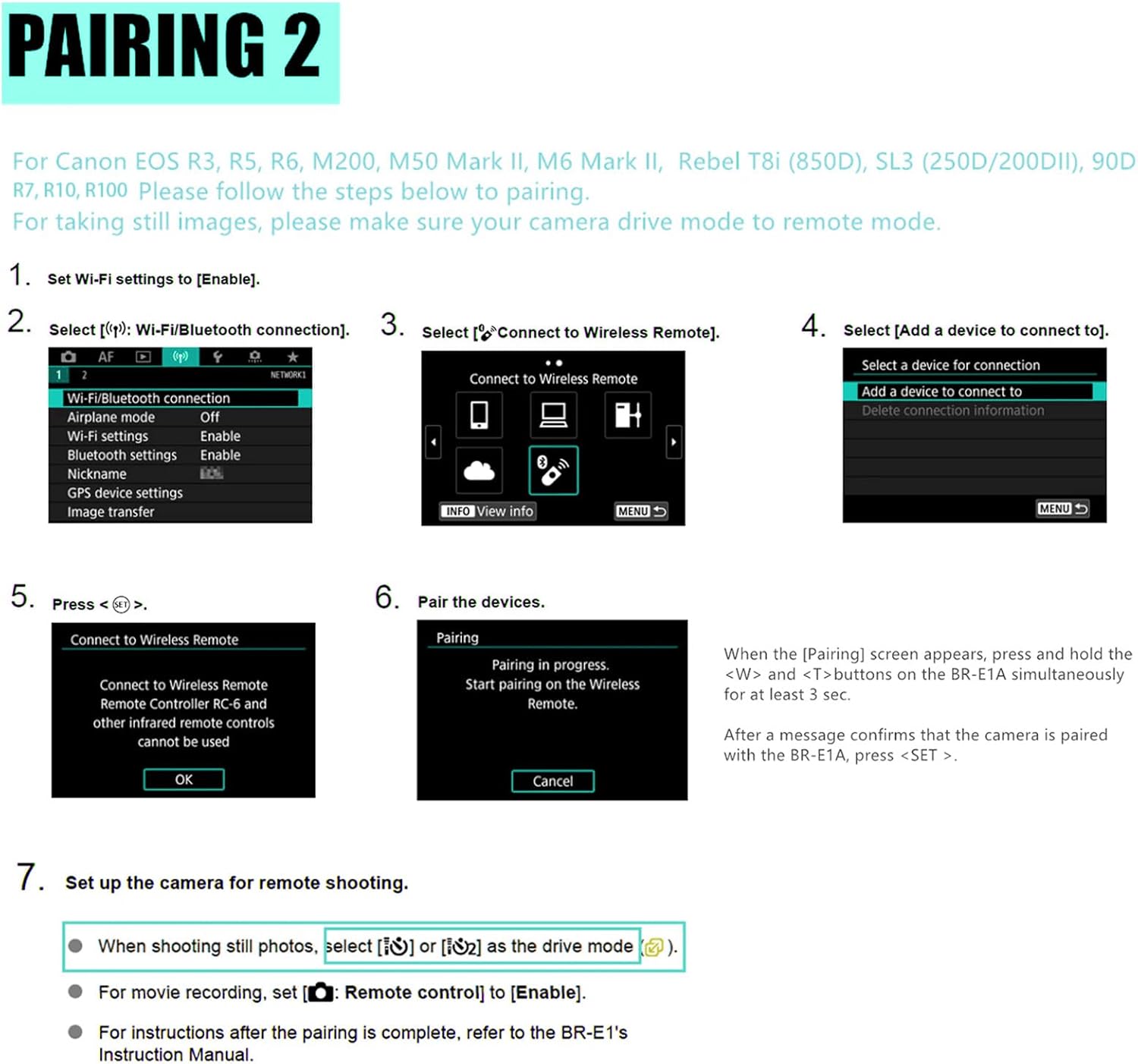 - Compatible with canon PowerShot V10, R8, R6 II, R100, R50, R10, Rebel EOS 850D(T8i), SL3 (ROS 250D), R3, R5, R6, EOR RP, EOS R, 6D Mark II, 77D, 800D(EOS Rebel T7i), 200D(EOS Rebel SL2), M50 II, M50, M200, PowerShot SX70 HS, EOS M6 Mark II, 90D, PowerShot G7 X Mark III, PowerShot G5 X Mark II.If it can not paired with your camera,pls read the details or send us directly
