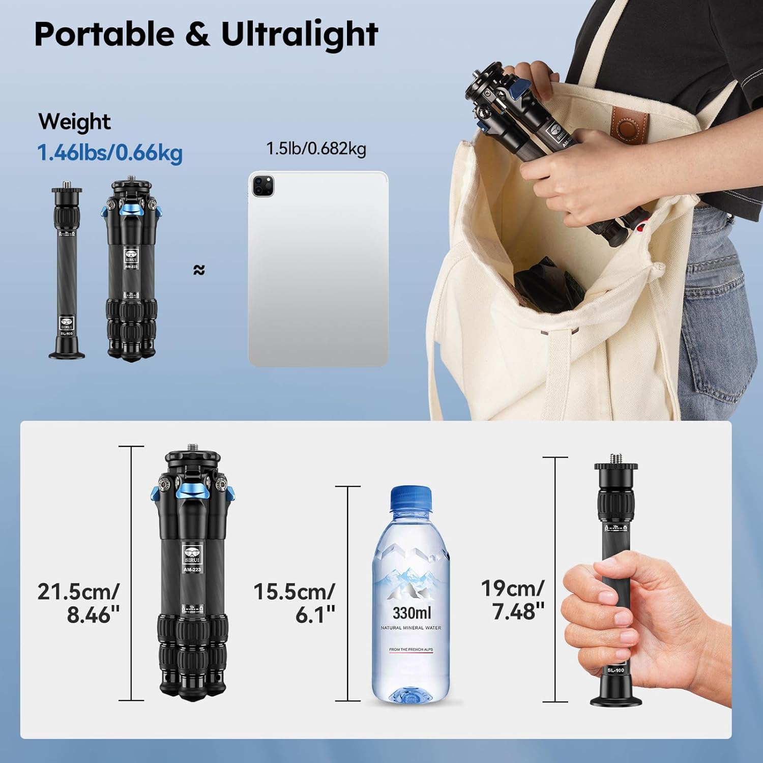 - Detachable Center Column: Two-section carbon center column SL-100 can be connected to mini tripod and increase extra height by 12.2"/32cm when it’s necessary or detached in seconds for lighter weight.