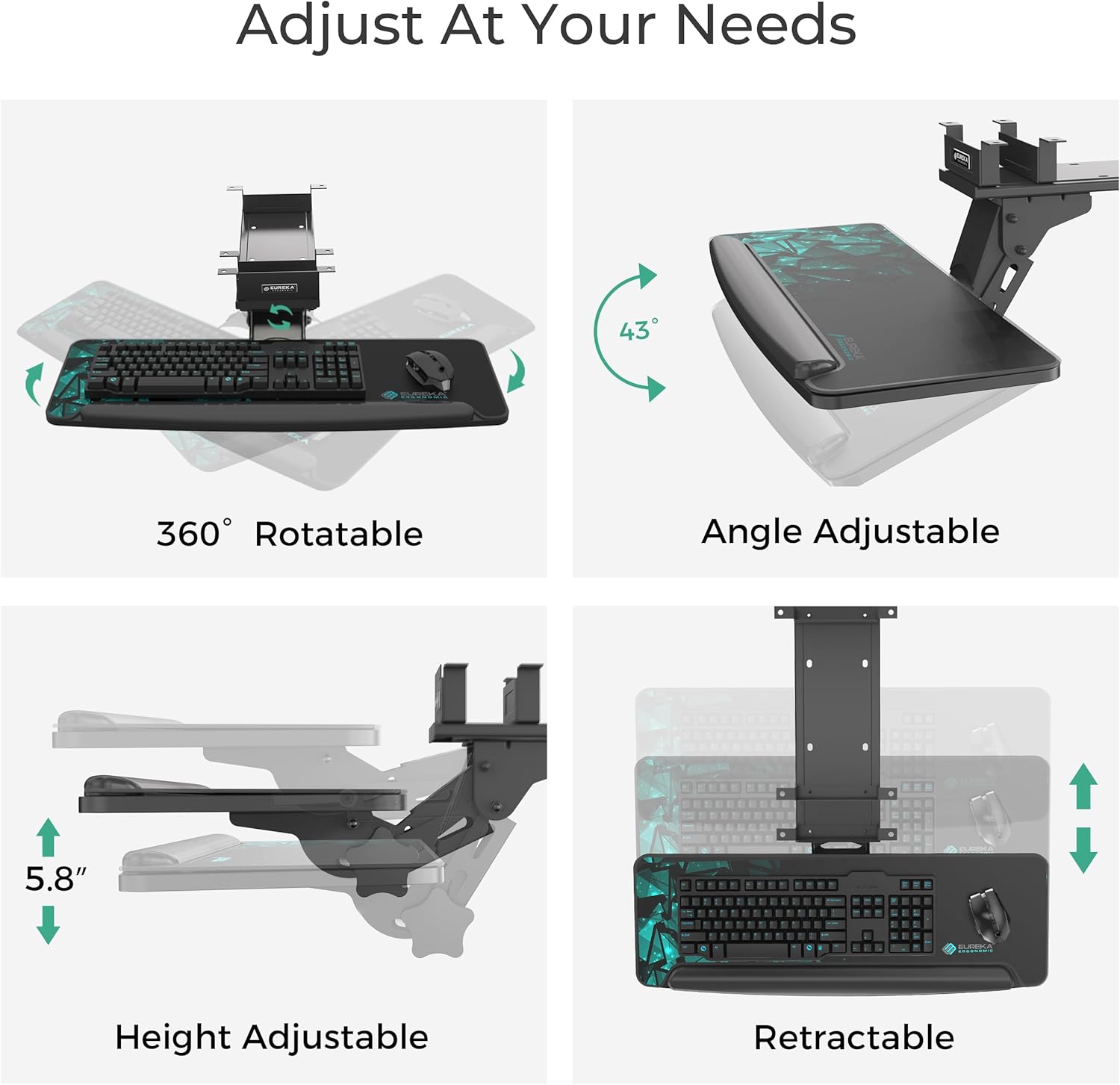 - 【Adjustable Slide-out Keyboard Tray】This ergonomic keyboard tray is height adjustable, 360° horizontally rotated/swiveling and 43°vertically tilted to your required position, pull it backward or forward. Note: The adjustable keyboard tray gravity self-locking setting prevents accidental pushing and pulling, and can be pushed and pulled smoothly by gently lifting it.