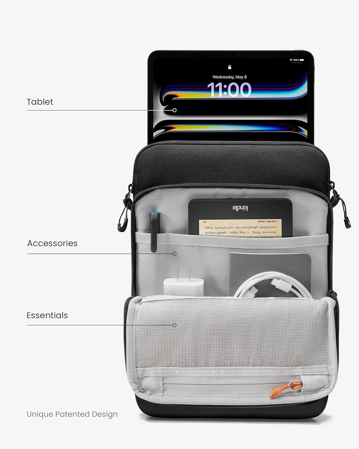 - Large Capacity with Patented Design: Thanks to the large number of inner compartments, all accessories are always neatly reached; The smart organized design offers a main pocket for your tablet and a unique patented front pocket with organized space for kindle, pen, accessories and important business essentials. soft back handle allows easy access to your device and accessories while in your backpack or messenger bag; Removable shoulder strap provide long time comfortably carrying