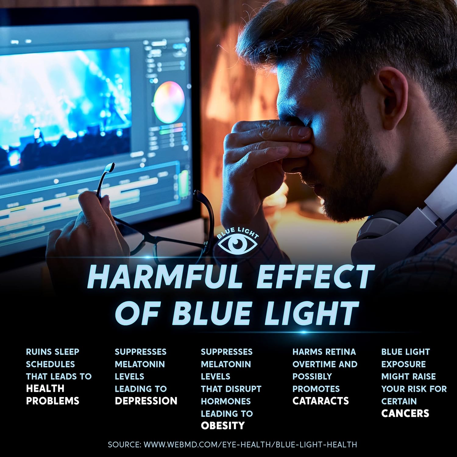 - PROTECT YOUR EYES AND LIVE HEALTHIER- With the heavy use of digital devices all day long, people are subjecting their eyes to Blue Light and UV light in amounts they never did before. Most people have 7.4 hours of daily screen time. Experts have linked the blue light portion of the light spectrum to insomnia and eye conditions like macular degeneration and cataracts. Blue light suppresses our body's release of melatonin, which helps regulate our sleep cycles.