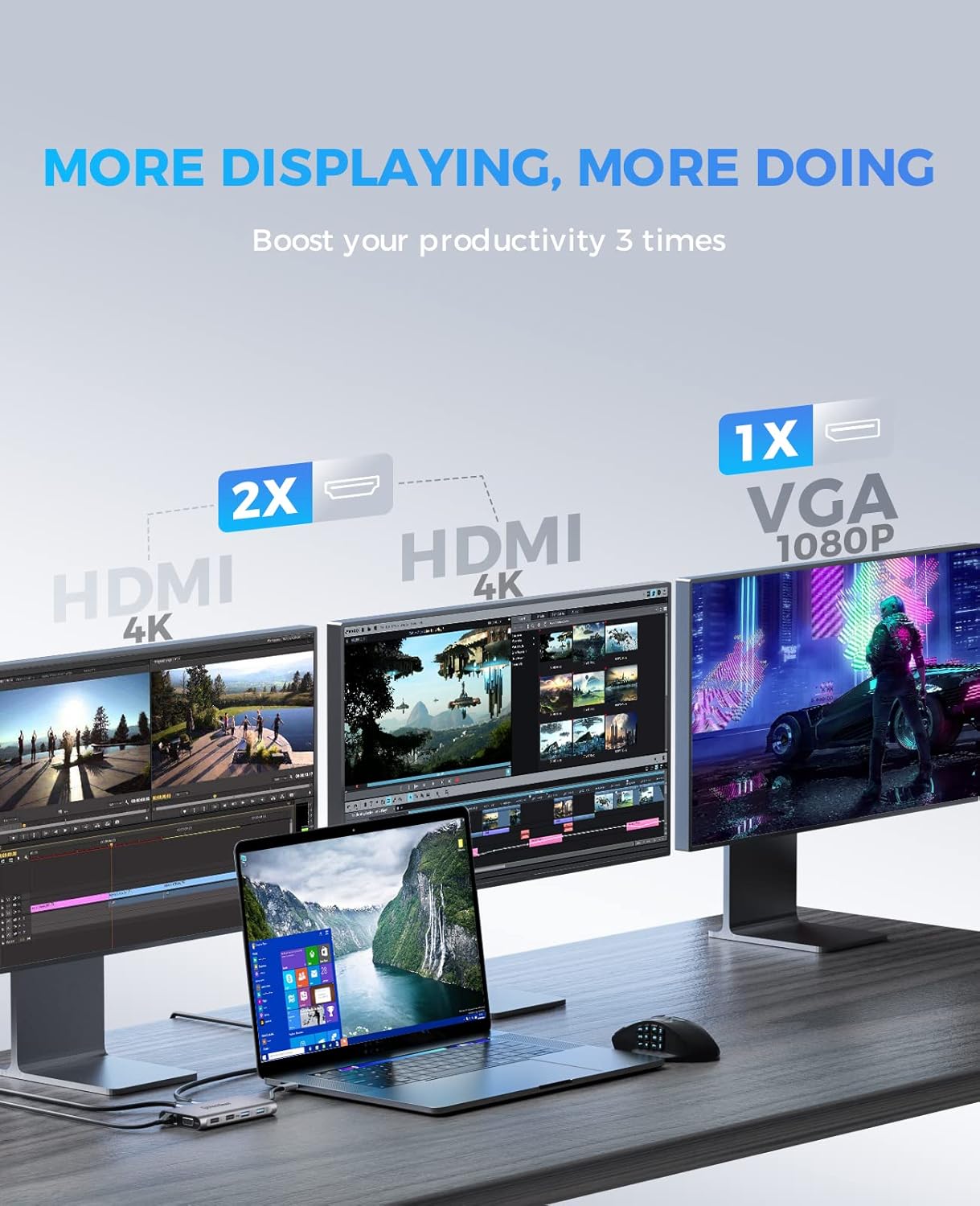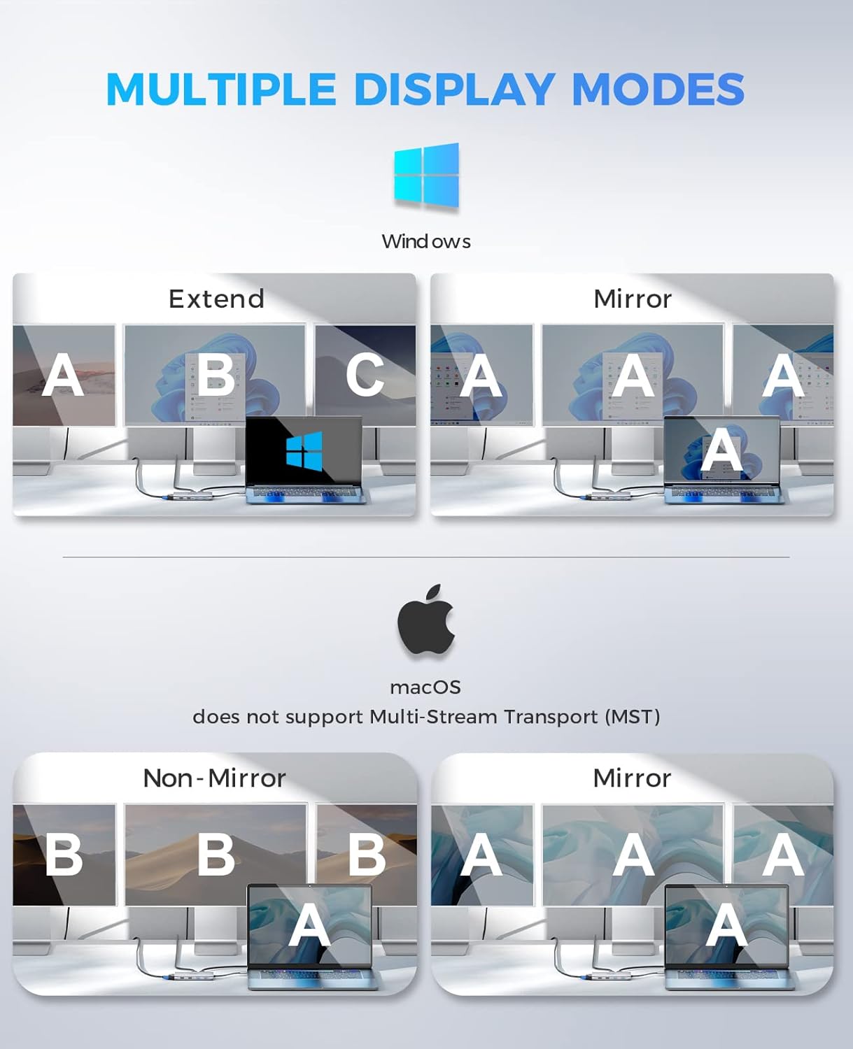 - 【Triple Monitors Display Flexibility】UtechSmart conquers this technical hurdle to create the first USB C docking station with triple display capability on the market. the UtechSmart docking station supports single and dual HDMI monitors up to 3840x2160@30Hz or triple monitors up to 1920x1080@60Hz. Three monitors modes Boost your efficiency 3 times. Note: It does not support extend mode for macOS.