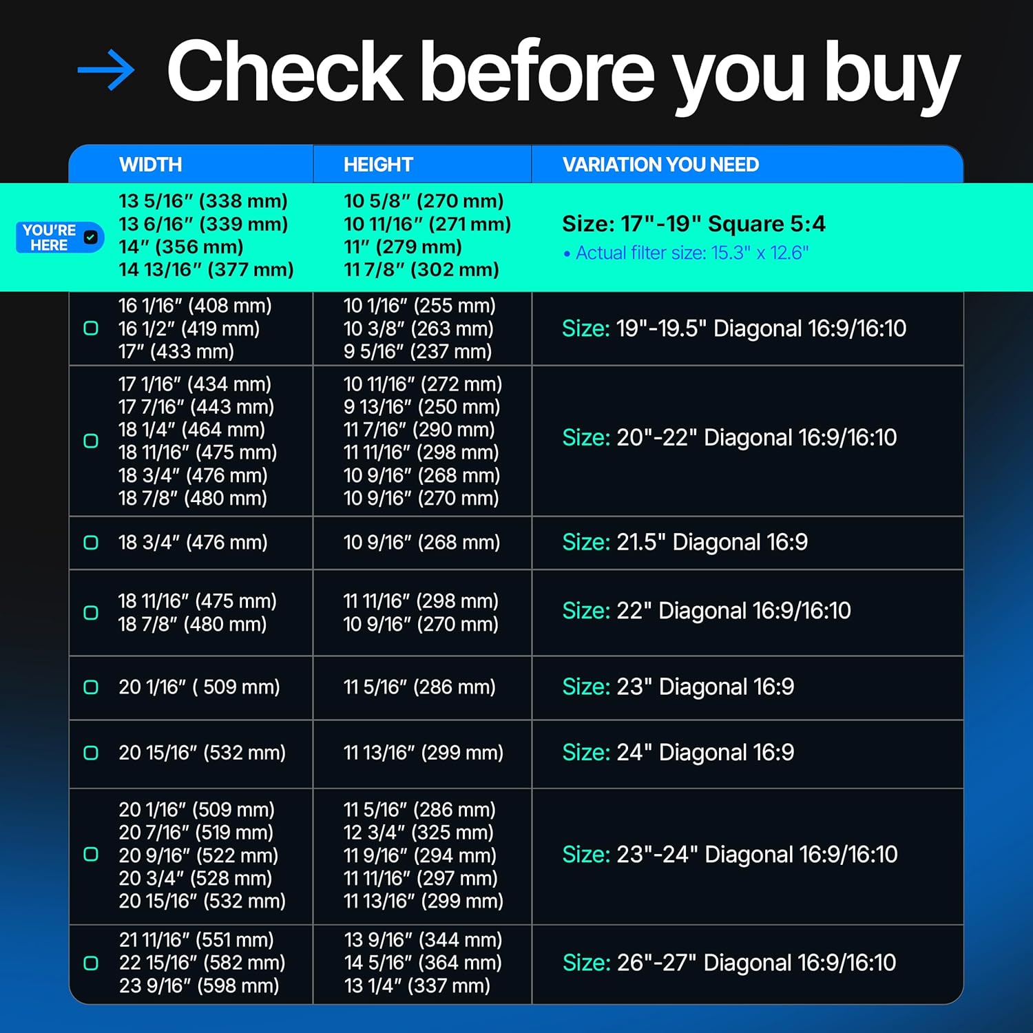 - Ideal Fit: Privacy screen protector fits screens sizes of 17", 17.1", 18.1", 19". Actual filter size: Width: 15.3 inches (390mm), Height: 12.6 inches (320mm). The filter enhances visual clarity and protects the eyes