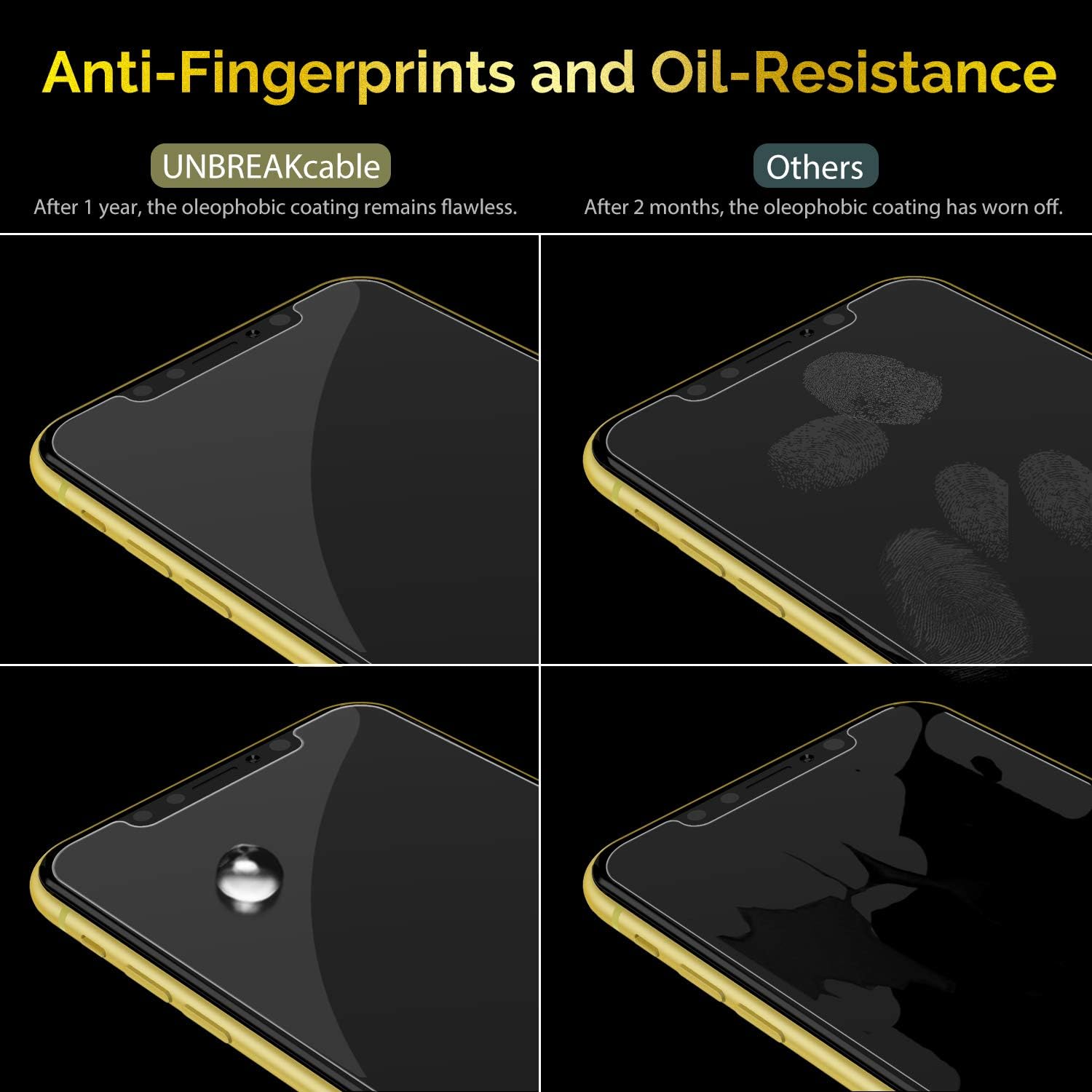 - ANTI-SCRATCH & IMPACT PROTECTION: UNBREAKcable iPhone 11/XR Screen Protector is made with reinforced technology. It resists scratches up to 9H, effectively protects your iPhone from unwanted scuffs and scratches that could be made by knife, keys and some other hard substances in your pocket.