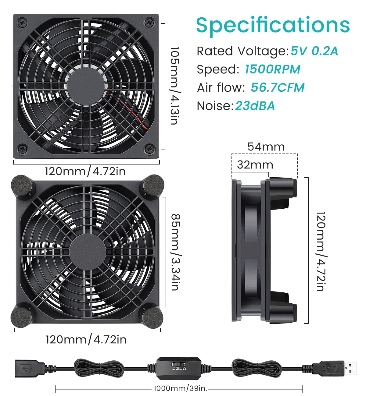 - USB Fan: Dimension: 120mm x 120mm x 25mm / 4.7x4.7x1 in. per fan; Rated Voltage:5V 0.2A; Speed: 1500RPM; Air flow: 56.7CFM; Noise:23dBA; Cable Length: 55cm Or 21 inches; Bearing: Sleeve ; Life: 35000 hours