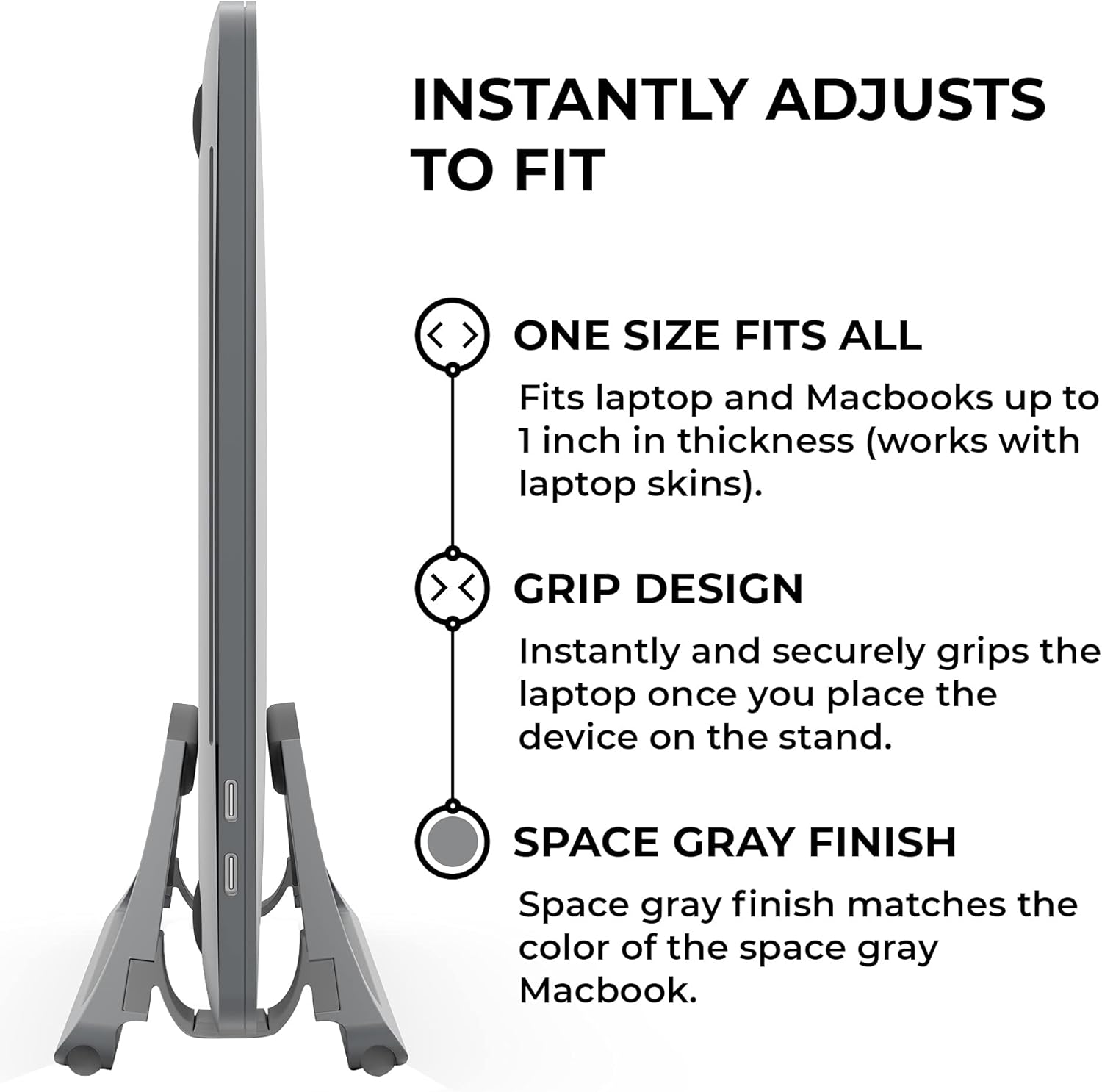 - INSTANTLY ADJUSTS TO FIT: No tools or inserts needed; the vertical laptop stand automatically grips the laptop when it is placed into the stand. Fits most laptops and Macbooks up to 1 inch in thickness including those with laptop skins and cases.