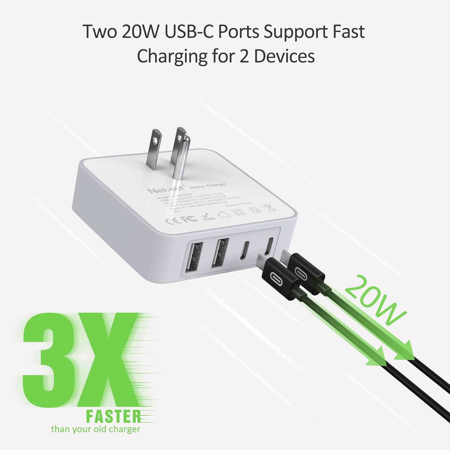 Nekmit USB C Charger, Thin Flat 52W 4-Port Fast Wall Charger with Two 20W Power Delivery and 2 Port for iPhone 14/14 Pro/14 Pro Max, Galaxy, Pixel, iPad Pro, AirPods More, Upgraded