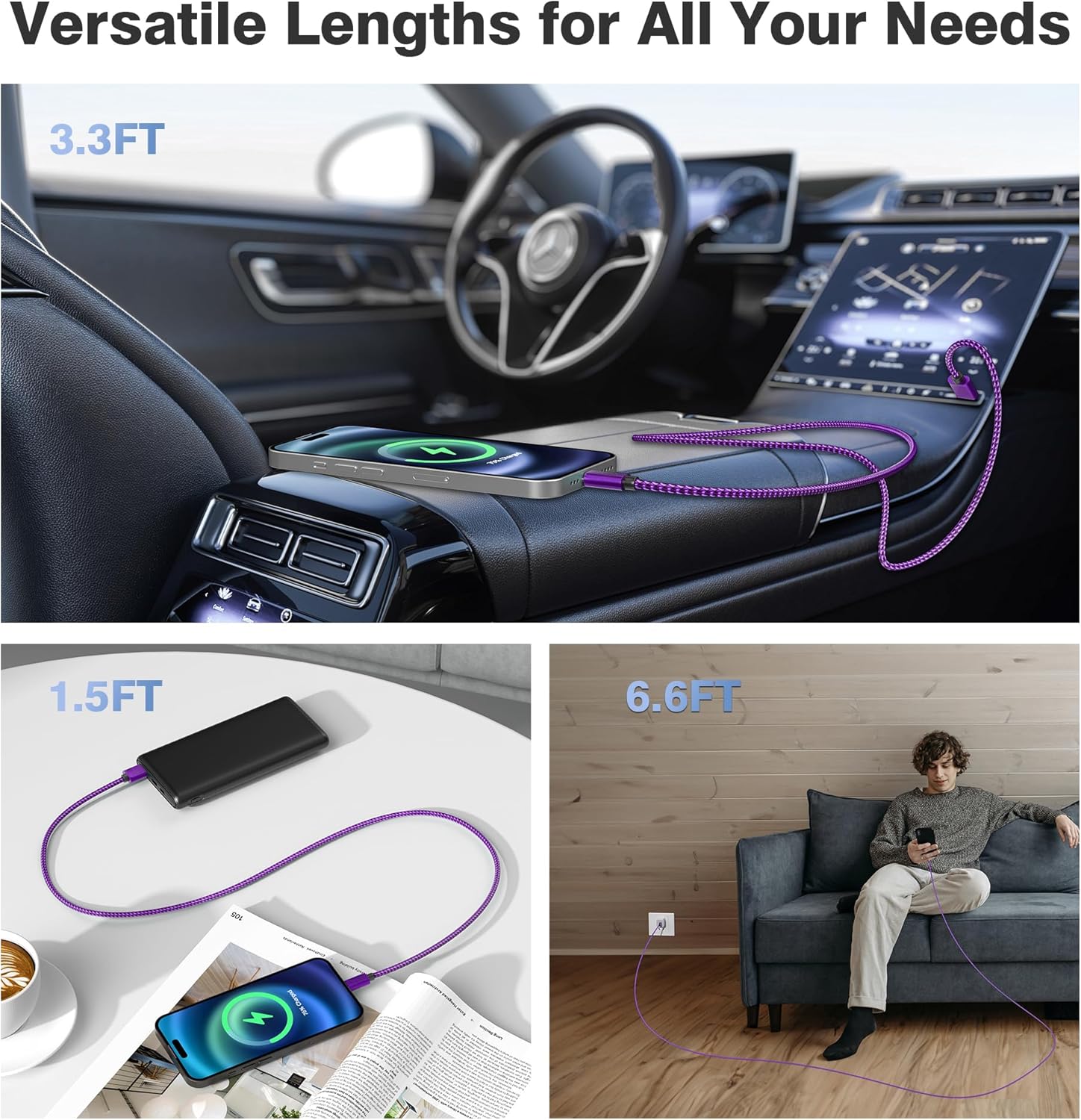 - Sort out all your charging needs with this handy three-pack of cables of different lengths and manage any excess cable with the velcro strap attached.