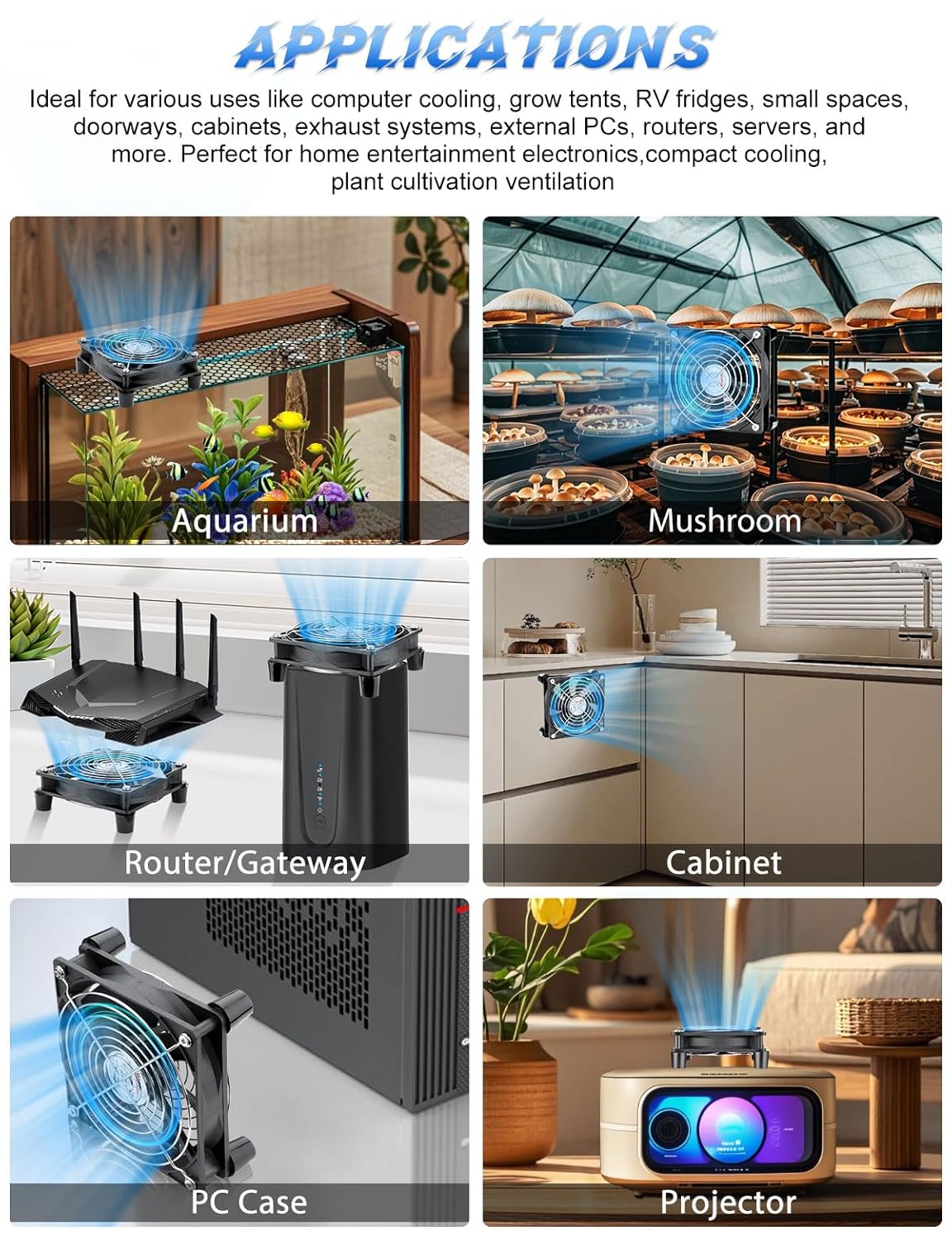 - Powerful Airflow: Used to DIY cool various electronic devices such as cigar humidor, TVs, mondems, routers, computer case, ps4, amplifier, fireplace, kitchen cabinet, window, server, humidifier, mushroom , grow tent, Reptile Enclosures and more