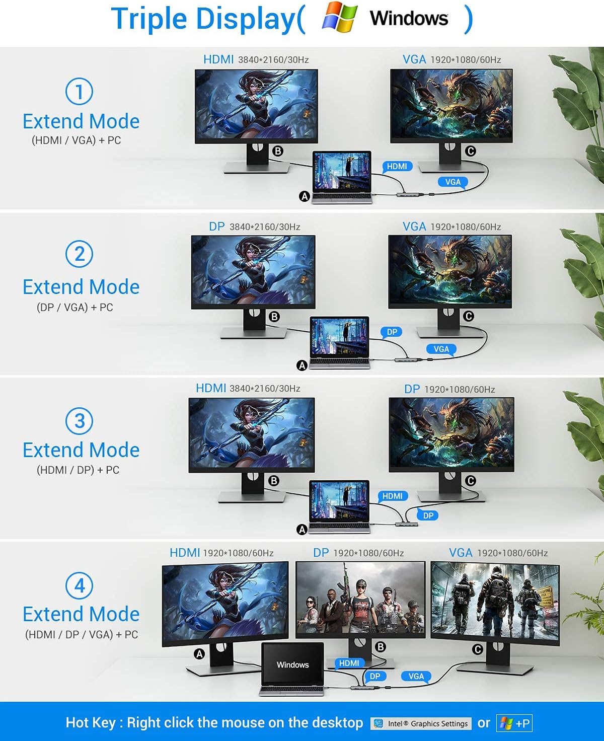 - Triple Display for Windows: Only support the Triple display for Windows(including laptop display). 3840x2160 output only available when using HDMI or DP display or mirror the three displays. In extend mode, each will be limited to a maximum resolution of 1080P.