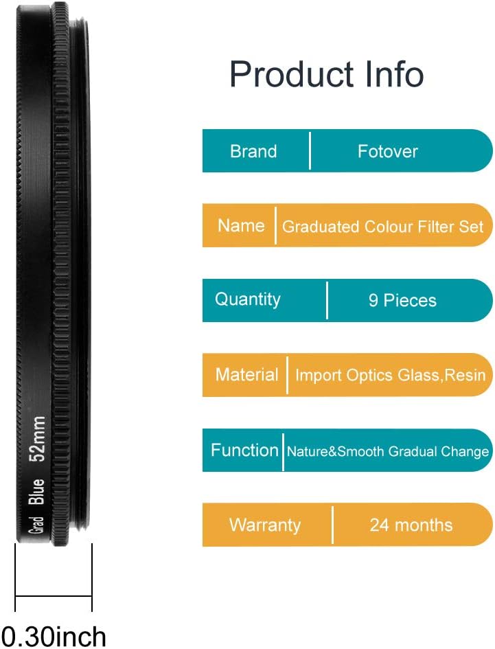 - [Package] :Includes 49mm Graduated Color Filter Kit (Gradual Orange, Blue, Grey, Red, Purple, Green, Pink, Brown, Yellow) ,1 x 10 Slot Nylon Filter Pouch and 1 x Microfiber Lens Cleaning Cloth.