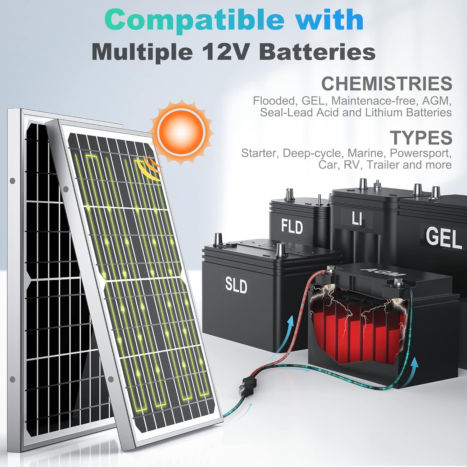 - 【Wide Compatibility】It's not just a solar powered battery charger, it's an advanced solar battery maintainer for 12-volt sealed lead-acid car, automotive, marine, RV, power sport, boat, dump trailer, motorcycle, trolling motor, tractor, ATV and deep-cycle batteries, including flooded, gel, AGM, SLA and maintenance-free, plus lifepo4 lithium batteries.