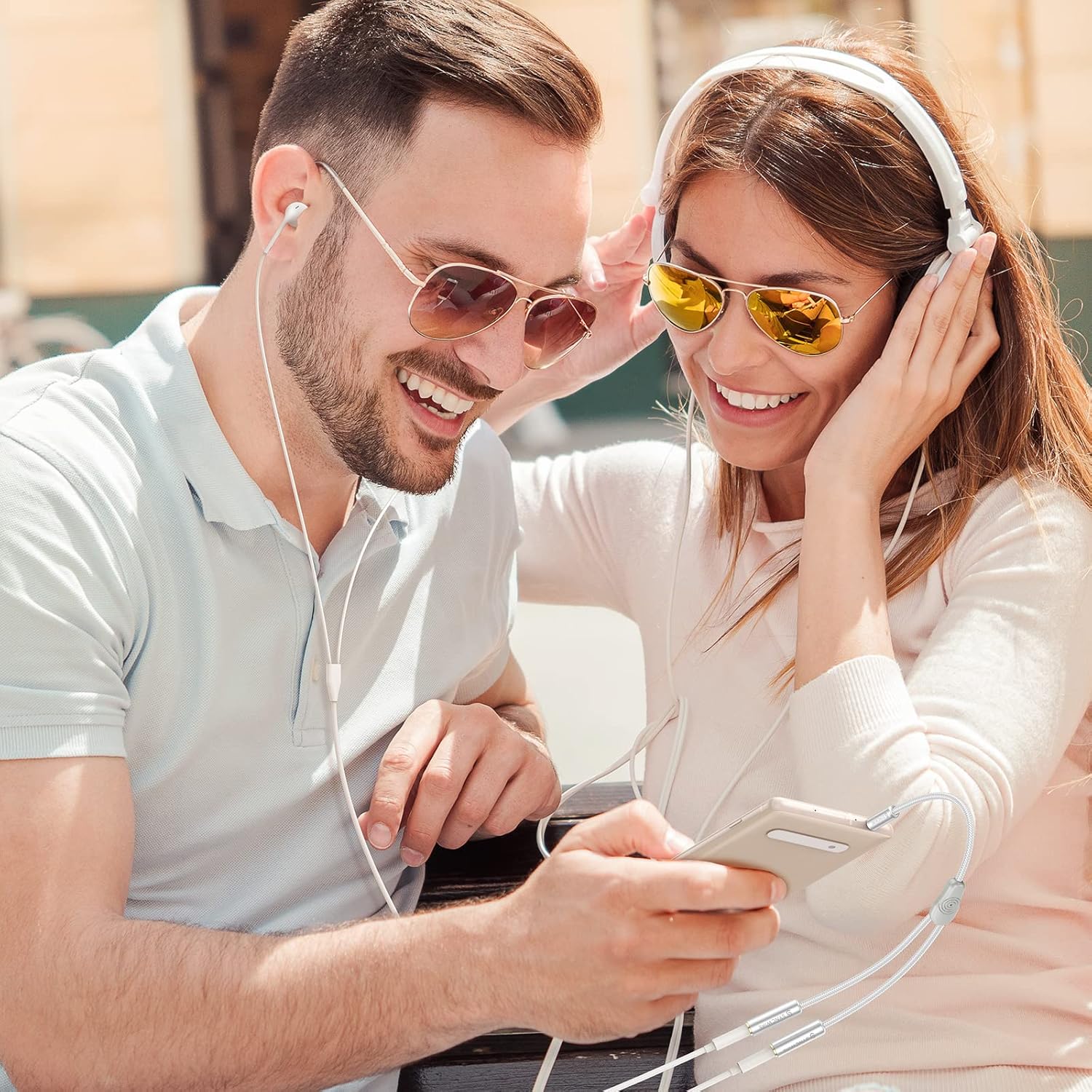 - Perfect Connection: This standard 3. 5mm jack headphone splitter extension cable can transfer audio from your iPhone, iPod, iPad, Samsung, MP3 players, CD players, Laptops, tablets, PlayStation, WII to 2 output devices including headphones, speakers and more. Compact and lightweight design(0.77ft, 22g) is ideal for your road trips and plane rides.
