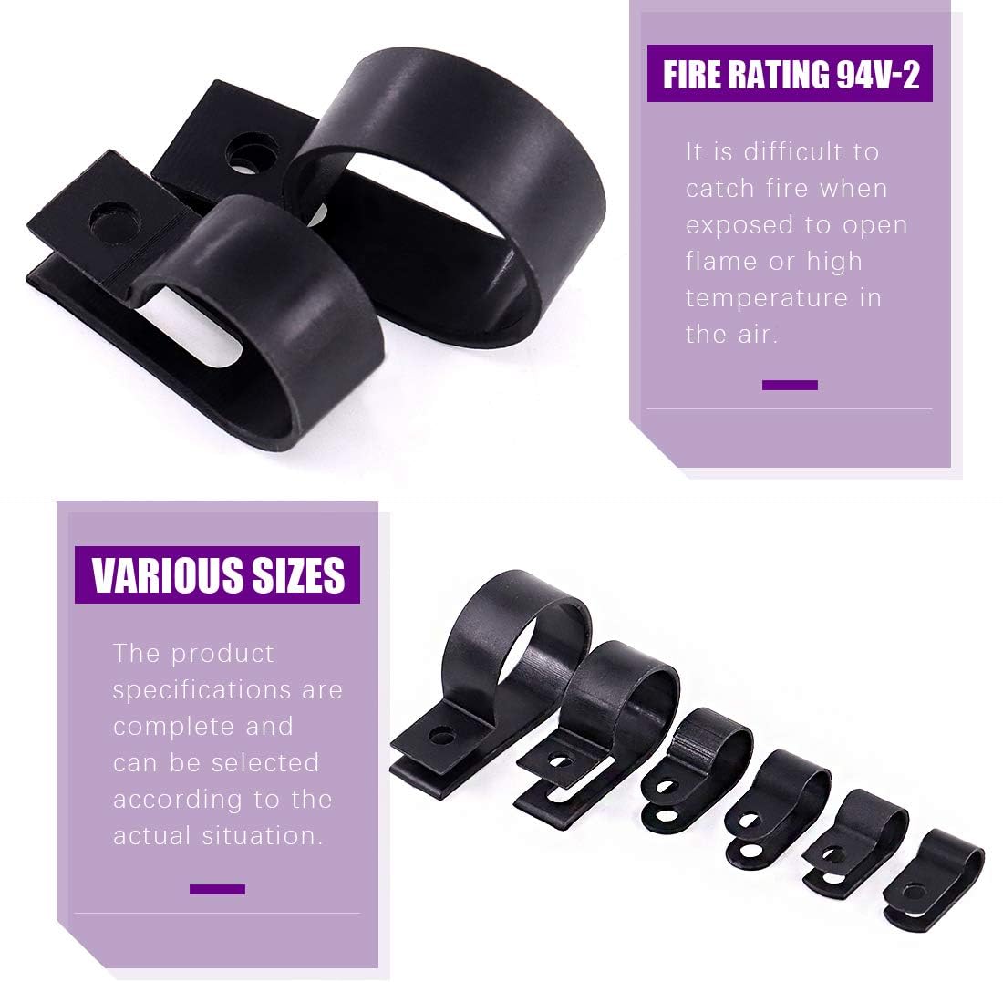 Swpeet 135 Pack 6 Sizes Black Nylon Plastic R-Type Cable Clips Clamp Assortment Kit, 1/4" 5/16" 3/8" 1/2" 3/4" 1" Nylon Screw Mounting Cord Fastener Clips with 135 Pack Screws for Wire Management