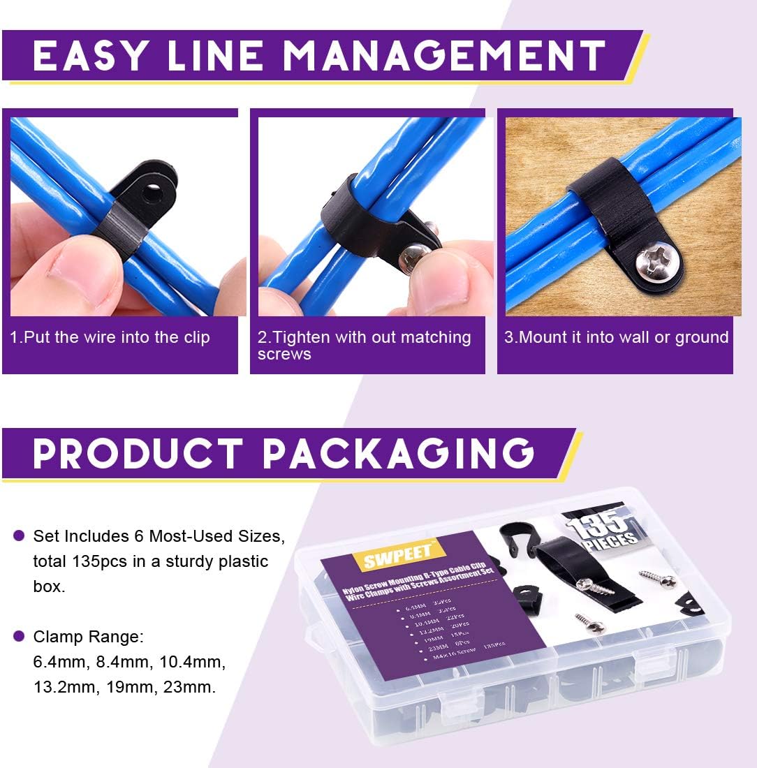 - ❤【 Equipped With Screws 】 --- In This Kit, You will get Swpeet 135 Pack 6 Sizes Nylon Plastic R-Type Cable Clamp Clips Assortment Kit, 6.4mm(1/4''), 8.4mm(5/16''), 10.4mm(3/8''), 13.2mm(1/2''), 19mm(3/4''), 23mm(1'') Nylon Clips with 135 Pack Screws for Wire Management. Screw size: Diameter: 4.2 mm, Length: 14 mm.