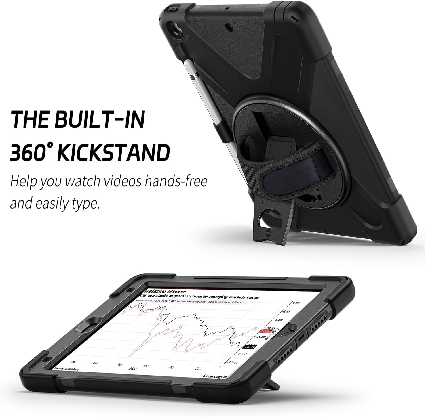 - [๐ ๐๐๐ญ๐ฎ๐ซ๐๐ฌ] The ๐๐ฎ๐ข๐ฅ๐ญ-๐ข๐ง ๐ค๐ข๐๐ค๐ฌ๐ญ๐๐ง๐ is ideal for watching videos and chatting. You can now adjust your iPad of 10.2 inches to whatever angle you want as this kickstand rotates 360 degrees. To easily pull out and store your Apple pencil, there is a ๐๐ฎ๐ข๐ฅ๐ญ-๐ข๐ง ๐๐ฅ๐๐ฌ๐ญ๐ข๐ ๐ฉ๐๐ง๐๐ข๐ฅ ๐ก๐จ๐ฅ๐๐๐ซ. There is an ๐๐๐ฃ๐ฎ๐ฌ๐ญ๐๐๐ฅ๐ ๐ฏ๐๐ฅ๐๐จ๐ซ ๐ก๐๐ง๐ ๐ฌ๐ญ๐ซ๐๐ฉ, which is ideal for kids and adults as it allows big and small hands. You can carry the tablet conveniently and safely with the help of the ๐๐๐ฃ๐ฎ๐ฌ๐ญ๐๐๐ฅ๐ ๐๐ง๐ ๐๐๐ญ๐๐๐ก๐๐๐ฅ๐ ๐ฌ๐ก๐จ๐ฎ๐ฅ๐๐๐ซ ๐๐๐ฅ๐ญ.