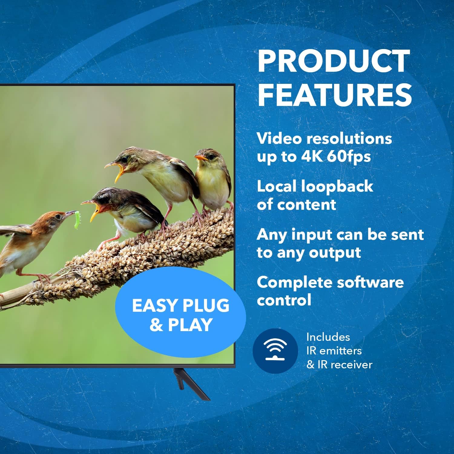 - Full Ultra HD Support - 4K 60/50Hz 12 bit, 4K@30Hz 24 bit, 1080p@50/60hz, 720p@60/50Hz, 576p@60/50Hz, 480p@60Hz. Supports all digital audio compatibility such as LPCM, DTS HD, and Dolby trueHD. HDMI 2.0 feature supports HDMI2.0 4K@50/60Hz YUV420. Latest HDCP 2.2/1.4 complaint. Supports RS-232 Function and Control 4 Driver. 4 Channel Bypass. Fulll EDID Managment. Support wideband IR(30-60Kh) Matrix Sytem. IR Transport Channel Can be Forwards and Backward