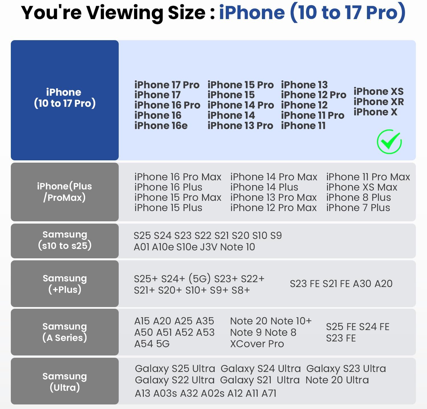 - Compatible Phone Models : iphone 17, 17 pro, 16, 16e, 16 pro, 15, 15 pro, 14, 14 pro, 13, 13 pro, 12, 12 pro, Xs, X, 10, 11, 11 pro, XR. iphone 17, 17 pro, 16, 16e, 16 pro, 15, 15 pro, 14, 14 pro, 13, 13 pro, 12, 12 pro, Xs, X, 10, 11, 11 pro, XR.