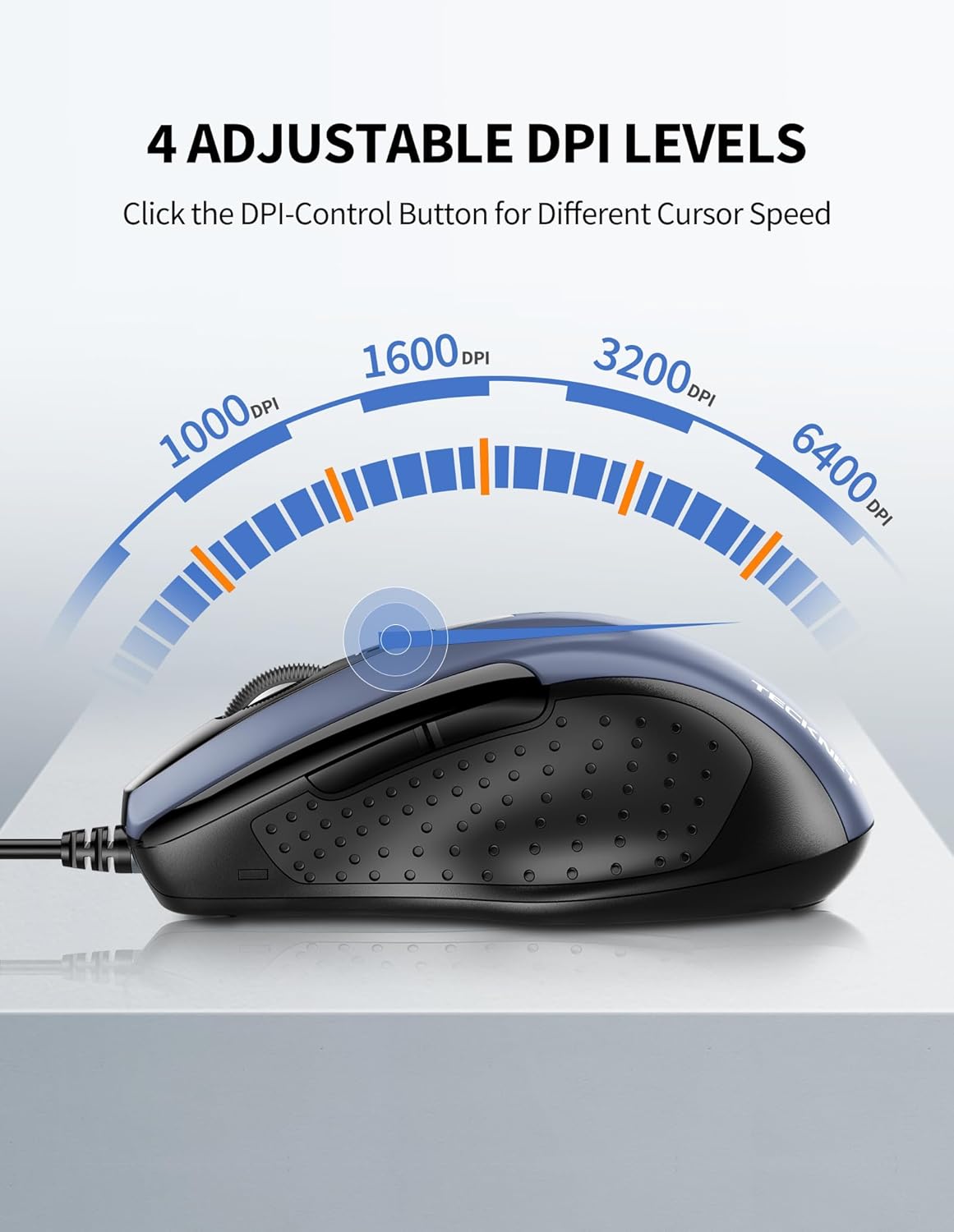 TECKNET USB Wired Mouse, 6-Button Corded Mouse with 4 Adjustable DPI, Optical Computer Mouse with Ergonomic Design and 5FT Cord for Laptop, Chromebook, PC, Desktop, Mac, Notebook-Blue
