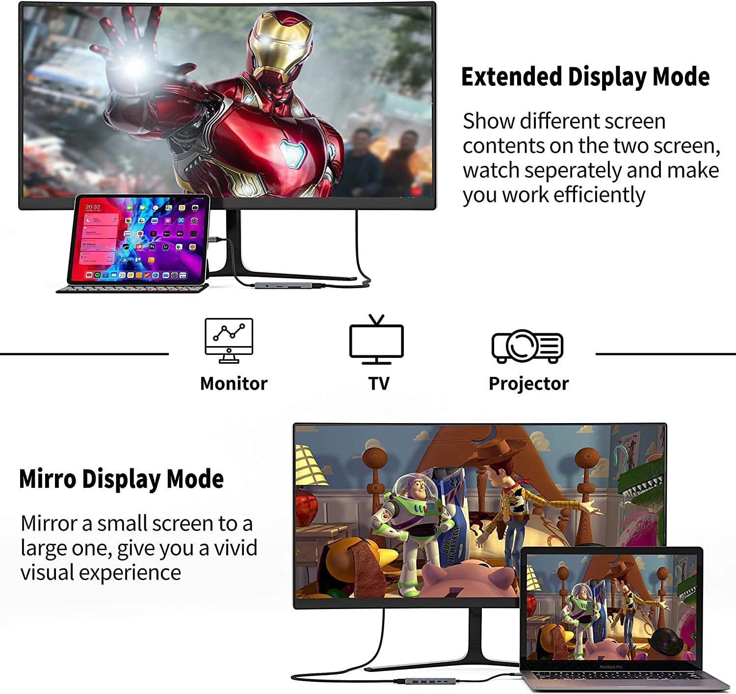 - Mirror or extend your screen through HDMI output port and directly stream 4K@30Hz,1080P@60Hz video to HDTV,monitors,or projectors. Ideal for school,office,home,and game.
