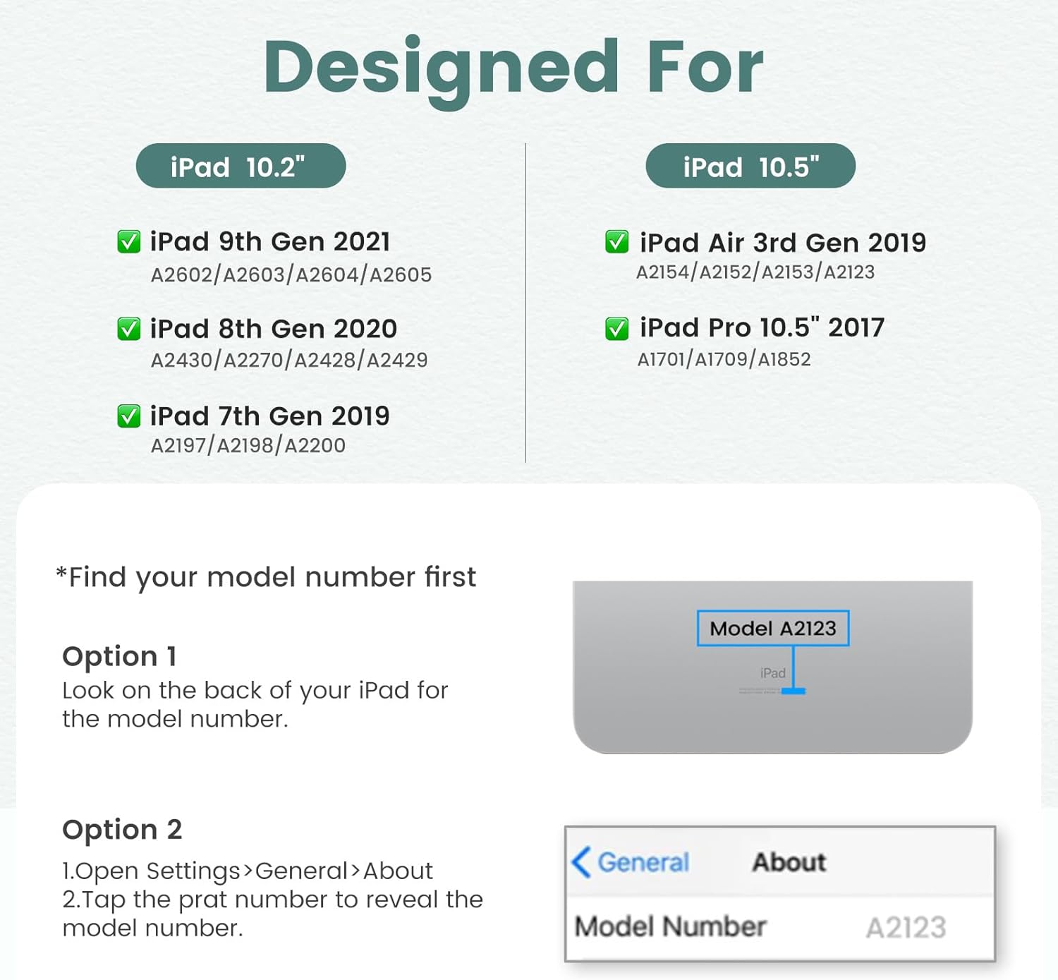 - ✅【7th/8th/9th Generation Case with Keyboard Compatibility】❗❗No pen or charge included!❗❗Our iPad keyboard case is designed for new iPad 9th 2021 (Model number: A2602/A2603/ A2604/ A2605),8th 2020 released (A2430/A2270/ A2428/ A2429), iPad 7th Generation 10.2 inch 2019 released (A2197/A2198/A2200), iPad Air 3rd Gen 10.5-inch 2019 released (A2152/A2123/A2153/A2154) and iPad Pro 10.5-inch 2017 released (A1701/A1709/A1852).Please check the back bottom of your iPad to find the model number.
