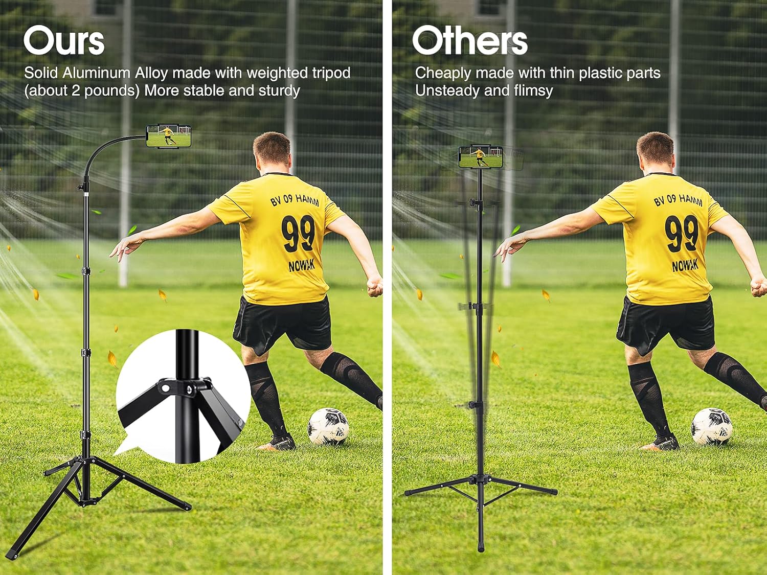 - More Stable & Flexible -- Heavy duty aluminum tripod (weighted 2lbs), 17in flexible gooseneck and 360 degree tilt rotation phone holder are combined to construct this most flexbile & tall iphone tripod stand. On the other hand, this tripod adopts the flip-locks structure, making it easily to be folded down to just 16 inches in seconds and capable of throwing in the car or side pack of a backpack.
