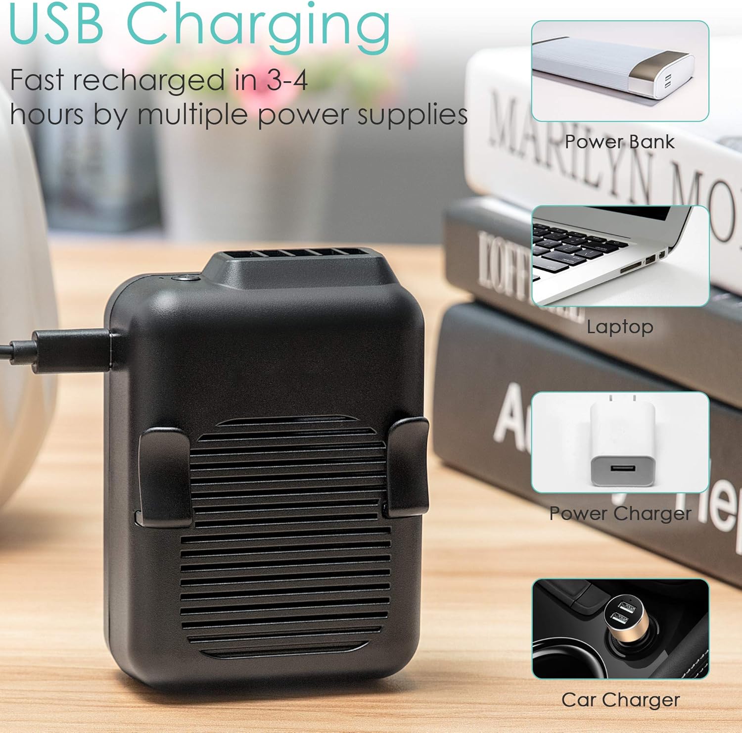 - What You Get: (1) Portable Mini Waist Fan; (2)USB Cable; (3) Neck Strap; (4) User Manual