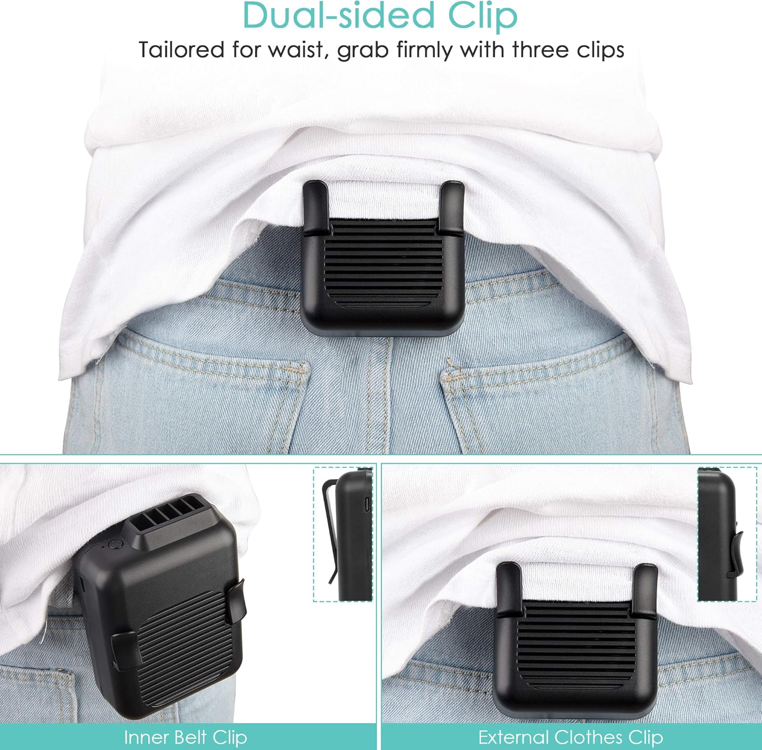 - 3-in-1 Waist Fan: This waist fan with compact size is specially designed with dual clips. The bigger one on the back for the belt and pants, while the smaller ones in front for fixing clothes corner. Plus, a necklace strap is included for better portability. You can clip the fan to waist, hang it around neck, or just hold it by hand to bring cool breeze everywhere