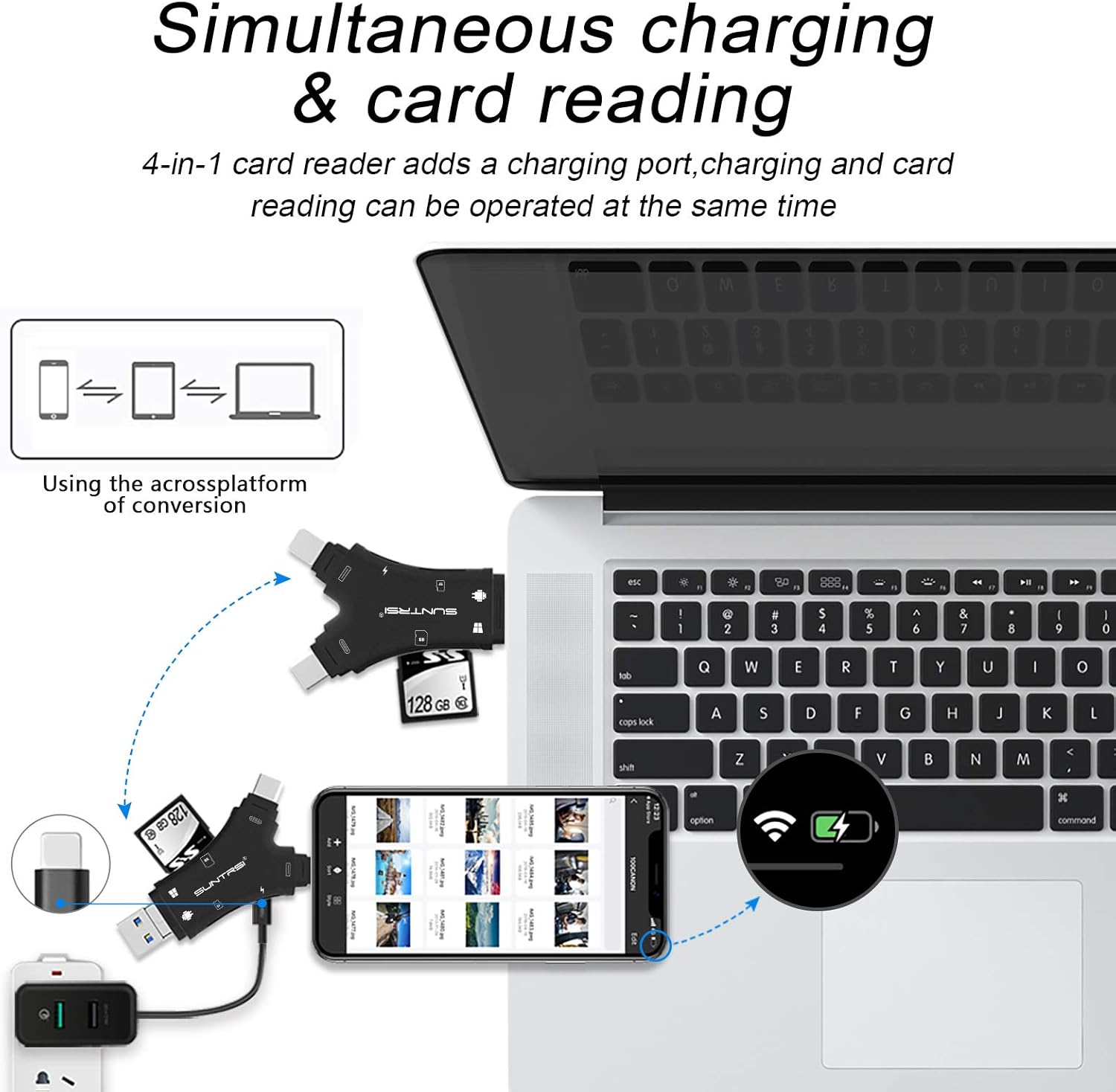 - 4 in-1 SD Card Reader:The memory card reader has various interfaces,usb / usb c(type c)/micro usb/sd card slot/micro sd card slot and iOS devices charging port for iPhone/iPad,which allows you to easily transfer the required files between different devices.