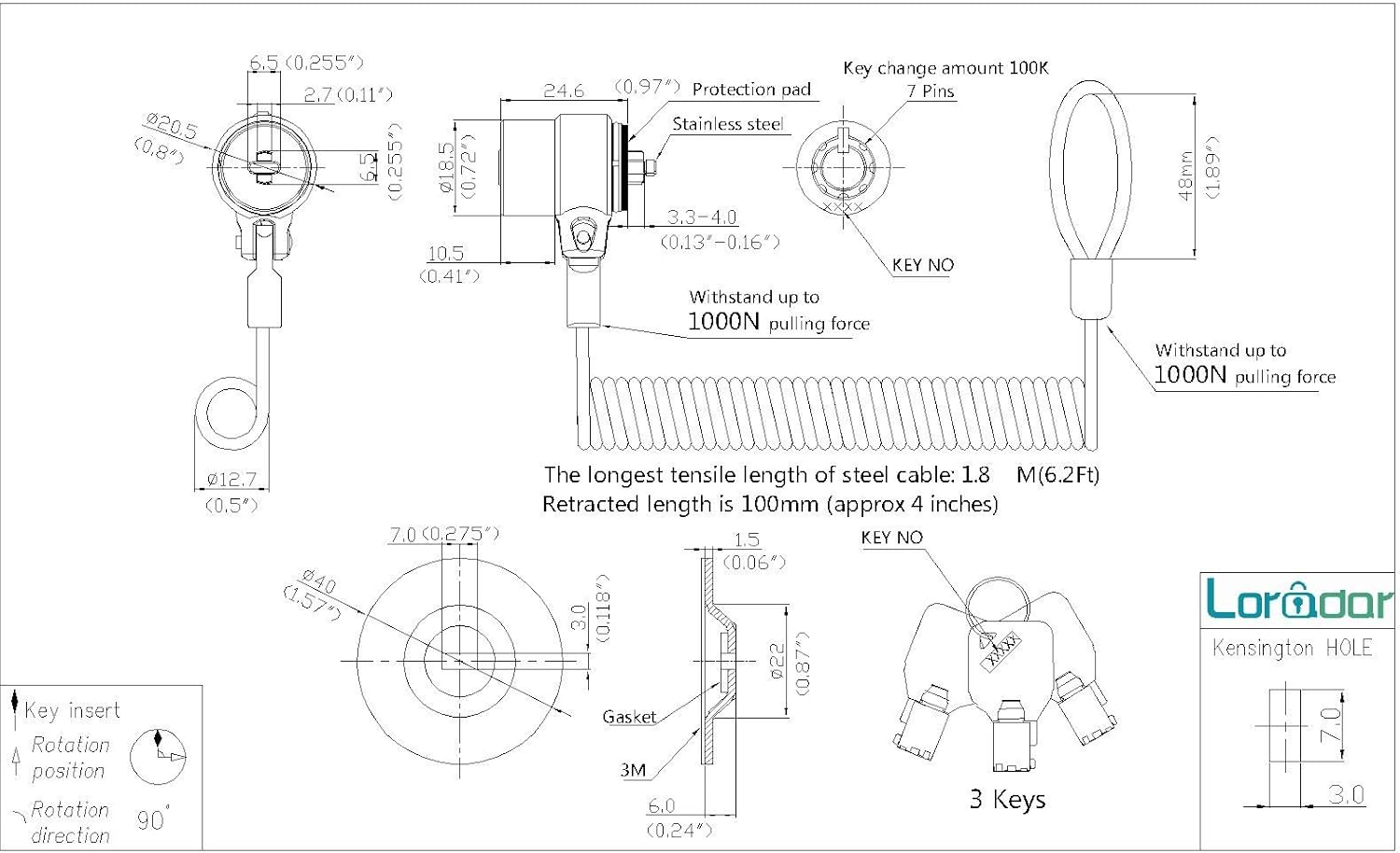- 【Self-rolling cable】 The maximum stretching length can reach 1800mm (6ft). The minimum rebound size is 100mm (4in). Anchor plate with strong adhesive, please wipe the sticking area clean before use, static pressure for 3-5 minutes, maximum pressure of 60lb after 48 hours The cable connector can withstand the maximum 1100N tensile test. This lock is exquisite and compact, with military quality, easy to carry and save space
