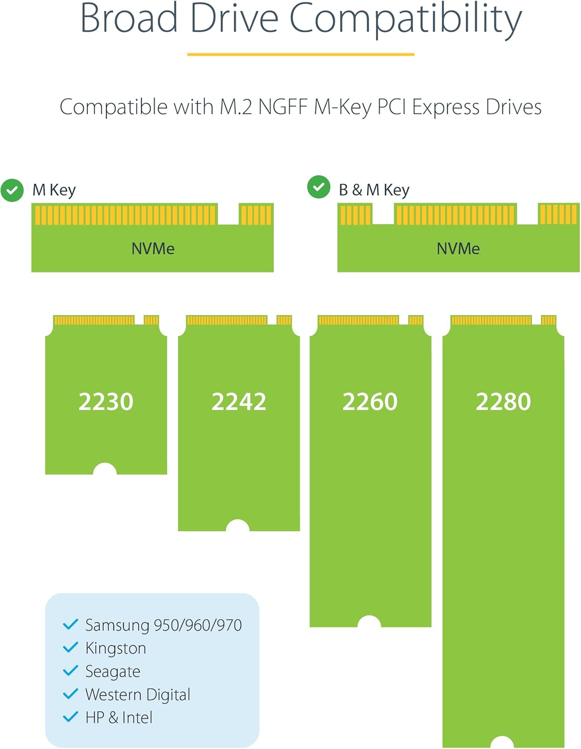 - BROAD DRIVE COMPATIBILITY: Compatible with M.2 NGFF M-Key PCI Express drives sized 2230/2242/2260/2280 including Samsung 950/960/970, Kingston, Seagate, Western Digital (WD), HP, and Intel SSD drives