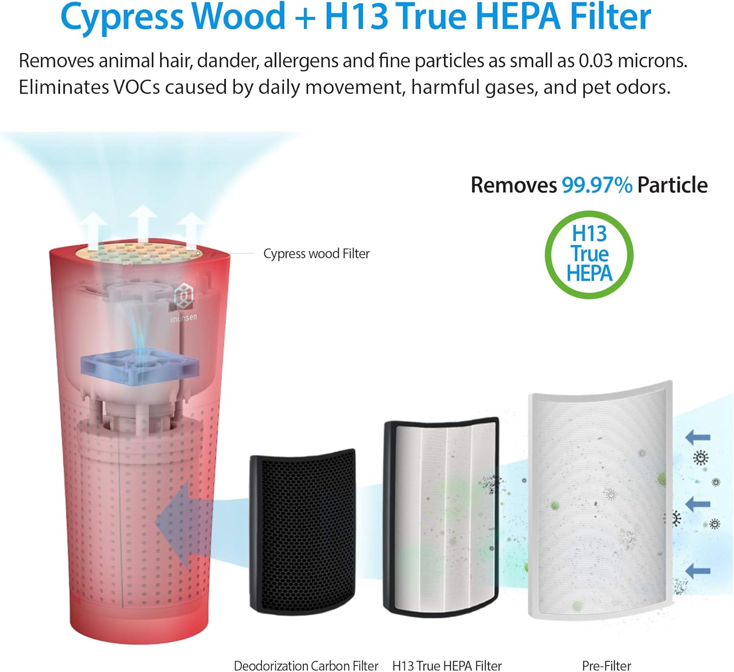 - 4 STAGE FILTRATION - H13 level true HEPA filter, deodorization carbon filter, pre-filter, and World’s first cypress wood filter. H13 level true HEPA filter is considered a medical grade and is higher than just True HEPA level. H13 True HEPA filter removes 99.97% of particles and captures allergens, pet hair & dander, smoke, odor and large dust particles. The product cannot be applied as a medical device.
