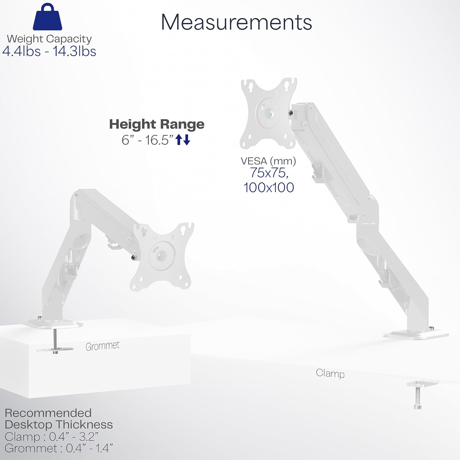 - Fits 17” To 27” Screens - This single monitor mount fits most screens 17” to 27” in size and up to 14.3 lbs in weight with 75x75mm or 100x100mm mounting holes. Suggested desktop thickness for the sturdy C-clamp is 0.4” to 3.2”, and an optional grommet mount is included to accommodate a variety of layouts.