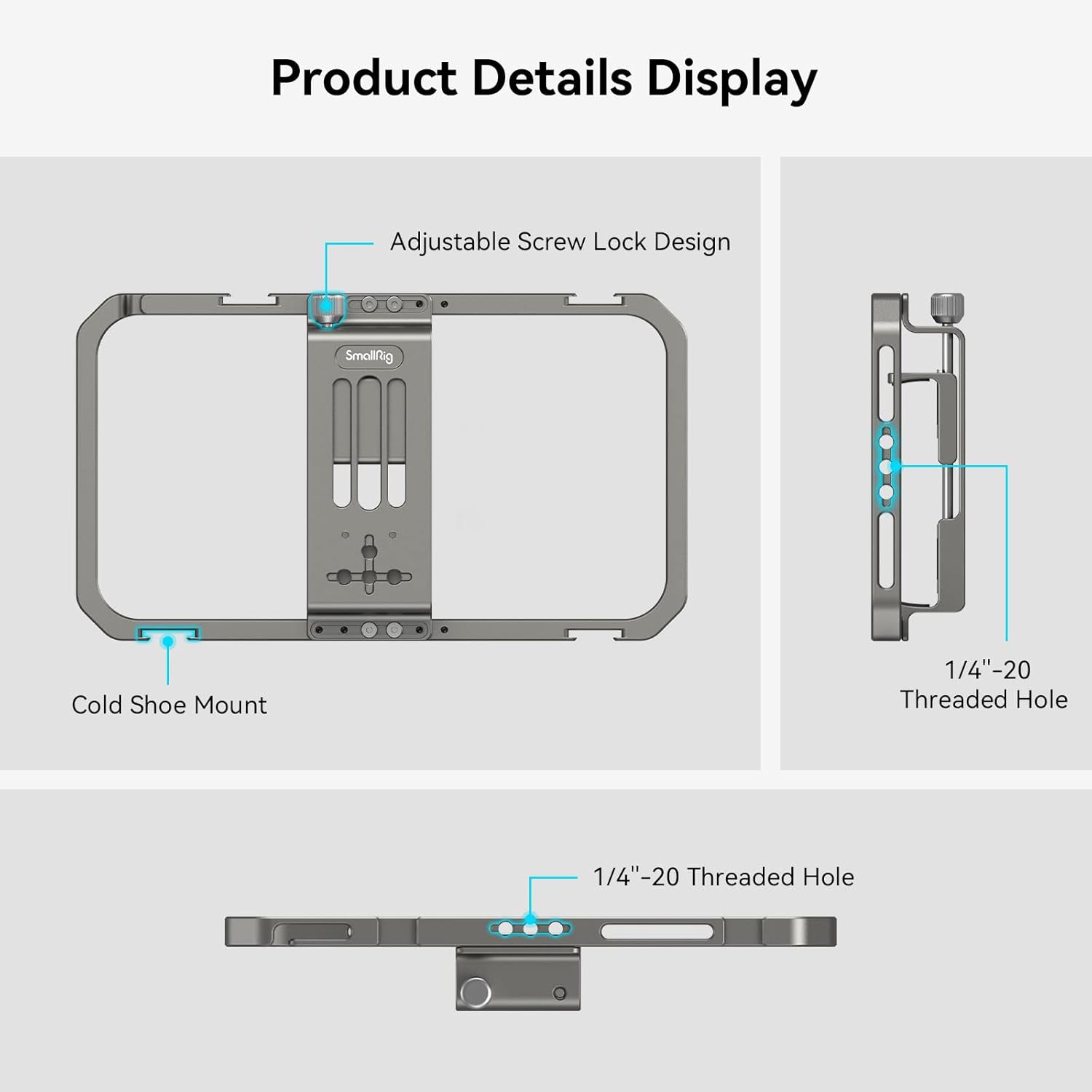 - 【One Device Endless Possibilities】The phone cage rig comes with multiple 1/4"-20 threaded holes and two cold shoes for attaching a tripod BUT2664, smartphone side handle 3838, LED light 3286, microphone 3452, cold shoe mount adapter 3577 and other accessories.
