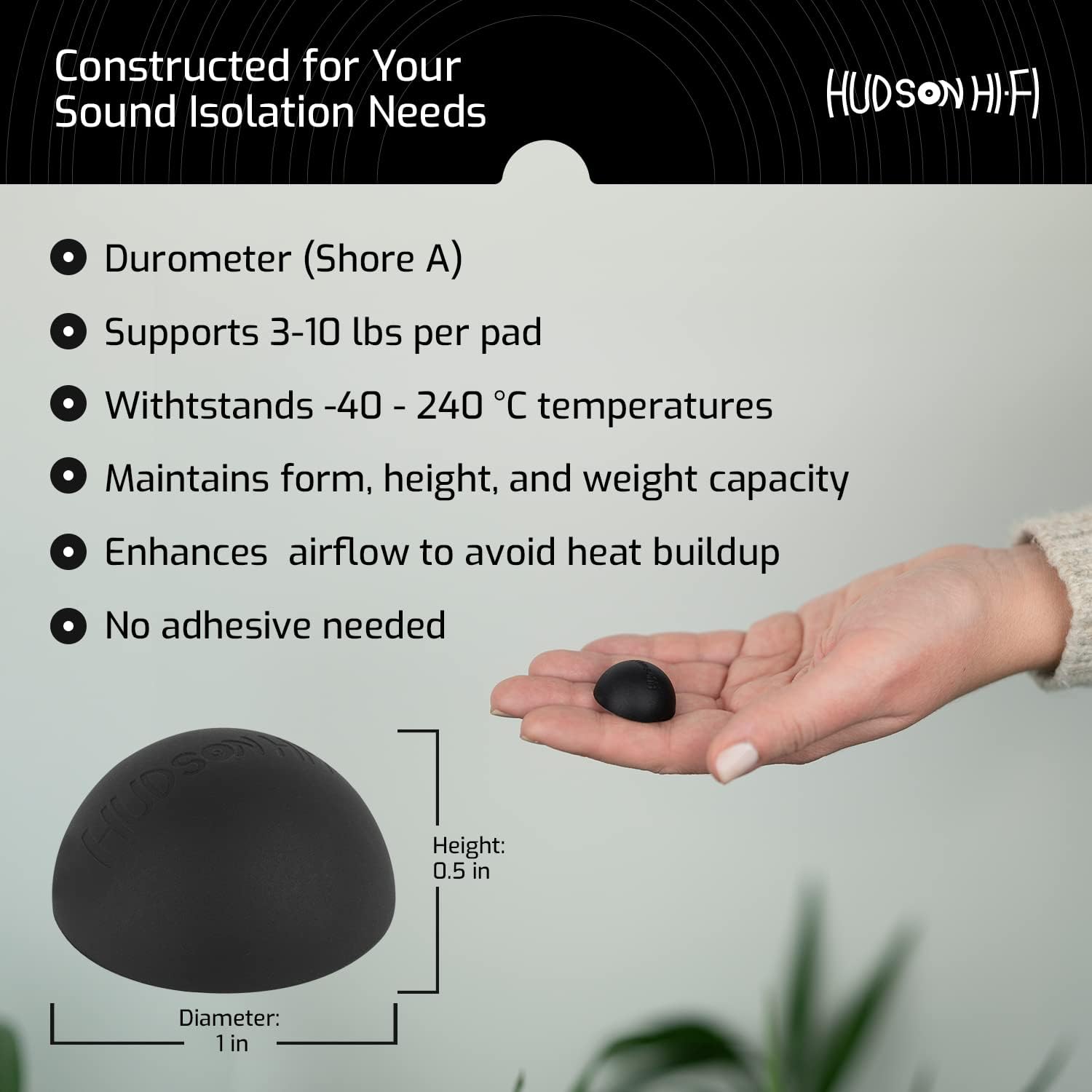 - REDUCE VIBRATION and RESONANCE. Absorbing up to 95.32% of vibration and resonance, Hudson Hi-Fi’s Isolation Feet offer an effective solution for optimizing the true sound of stereo equipment. Isolation Feet effectively reduce vibration for all sensitive equipment.