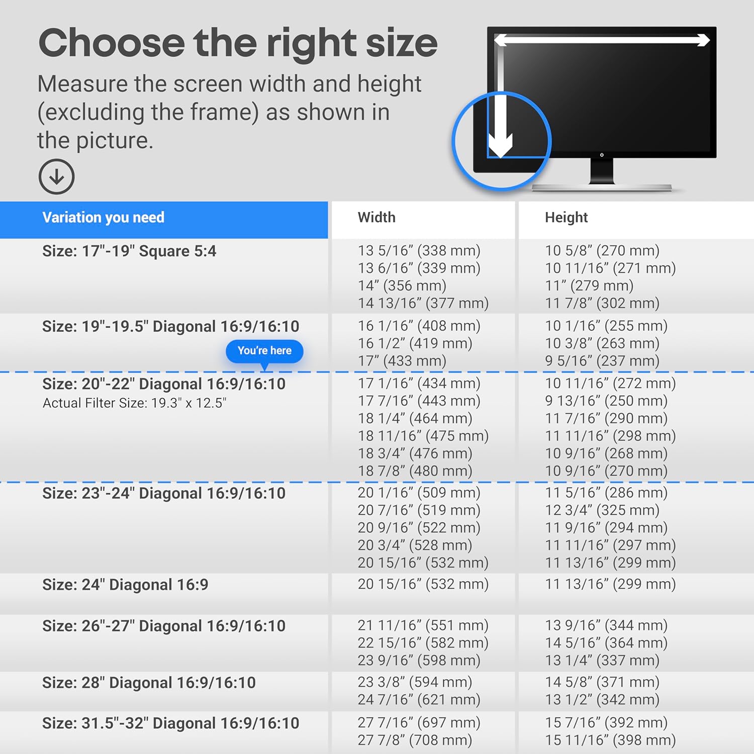 - Ideal Fit: Blue light screen for monitor fits screens sizes of 20"-22" (20", 20.2", 21.5", 21.6", 22"). Actual filter size: Width: 19.3 inches (490mm), Height: 12.5 inches (317mm). Ideally compatible with HP, Samsung, Dell, ASUS, LG, Huawei, MSI, and other monitor and laptop brands
