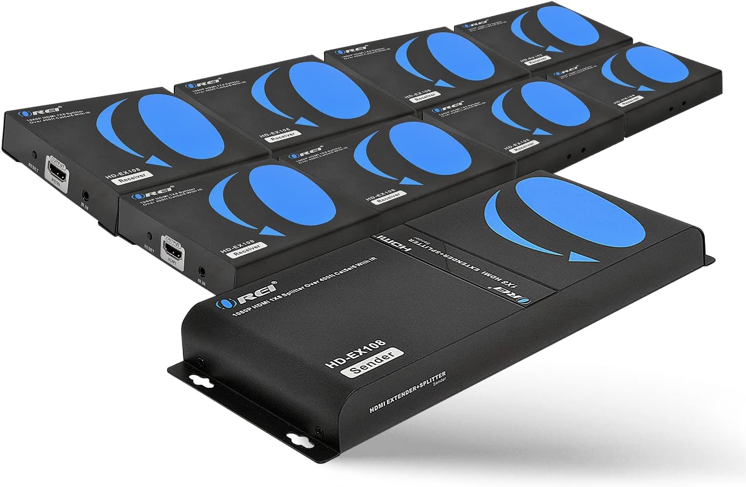 OREI 1080P 1x8 HDMI over Ethernet Extender Splitter CAT6/7 Over Cable Full HD with IR Remote EDID Management - Up to 400 Ft - Low Latency - Full Support, 1x8 upto 395 FT (HD-EX108)