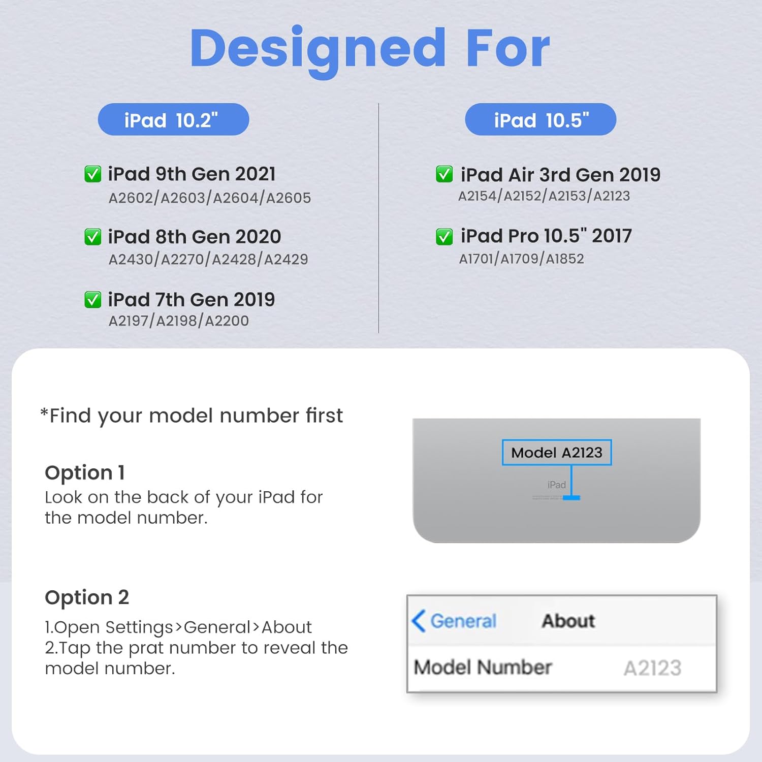 - ✅【Compatibility with IPad 10.2/10.5 inch Keyboard Case 】❗❗No pen or charger included!❗❗The iPad keyboard case is designed for new iPad 9th 2021 (Model number: A2602/A2603/ A2604/ A2605),8th 2020 released (A2430/A2270/ A2428/ A2429), iPad 7th Generation 10.2 inch 2019 released (A2197/A2198/A2200), iPad Air 3 10.5" 2019 released (A2152/A2123/A2153/A2154) and iPad Pro 10.5 inch 2017 released (A1701/A1709/A1852). Please check the back bottom of your iPad to find the model number.