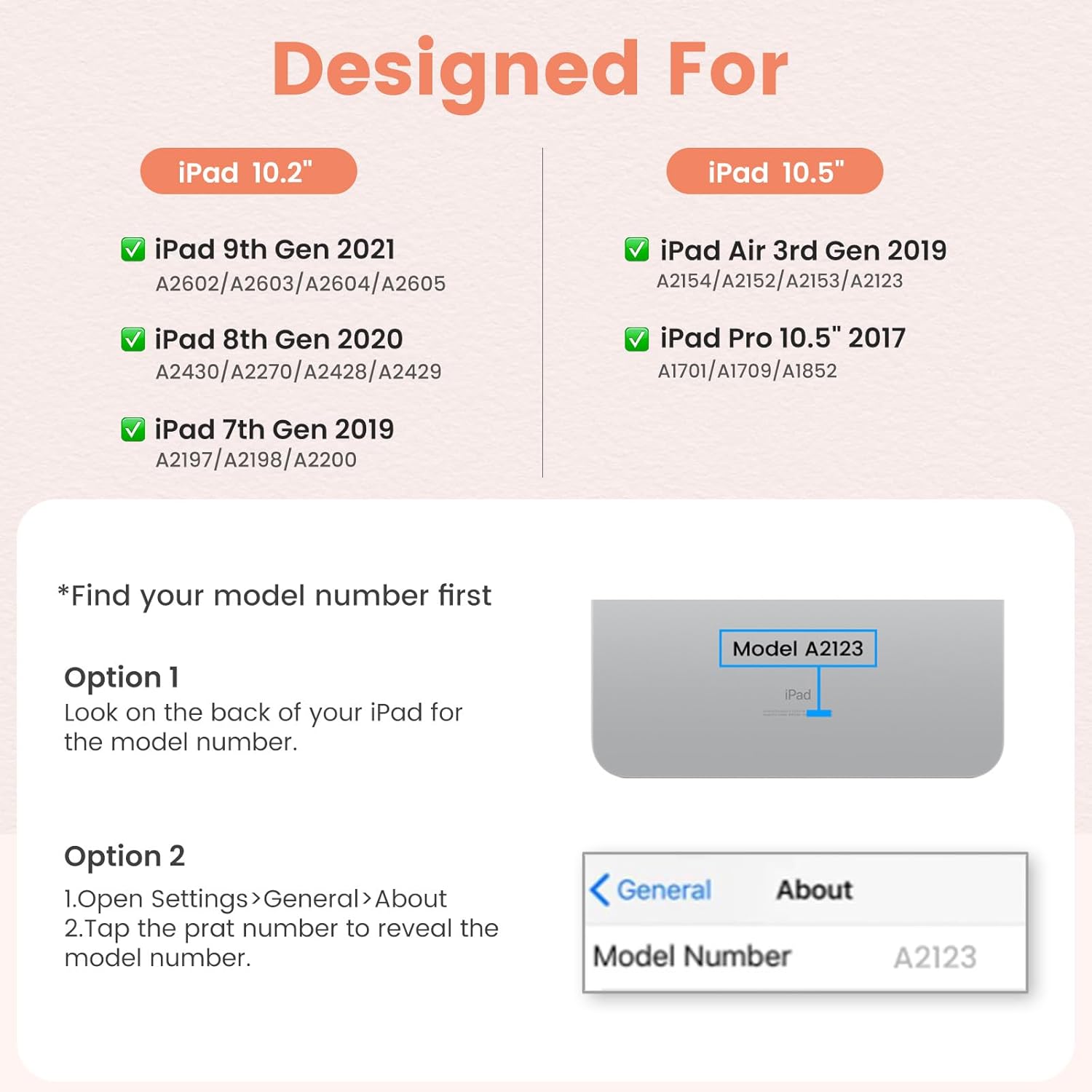 - ✅【IPad 10.2/10.5 inch Keyboard Case Compatibility】❗❗No pen or charge included!❗❗The iPad keyboard case is designed for new iPad 9th 2021 (Model number: A2602/A2603/ A2604/ A2605),8th 2020 released (A2430/A2270/ A2428/ A2429), iPad 7th Generation 10.2 inch 2019 released (A2197/A2198/A2200), iPad Air 3 10.5" 2019 released (A2152/A2123/A2153/A2154) and iPad Pro 10.5 inch 2017 released (A1701/A1709/A1852). Please check the back bottom of your iPad to find the model number.
