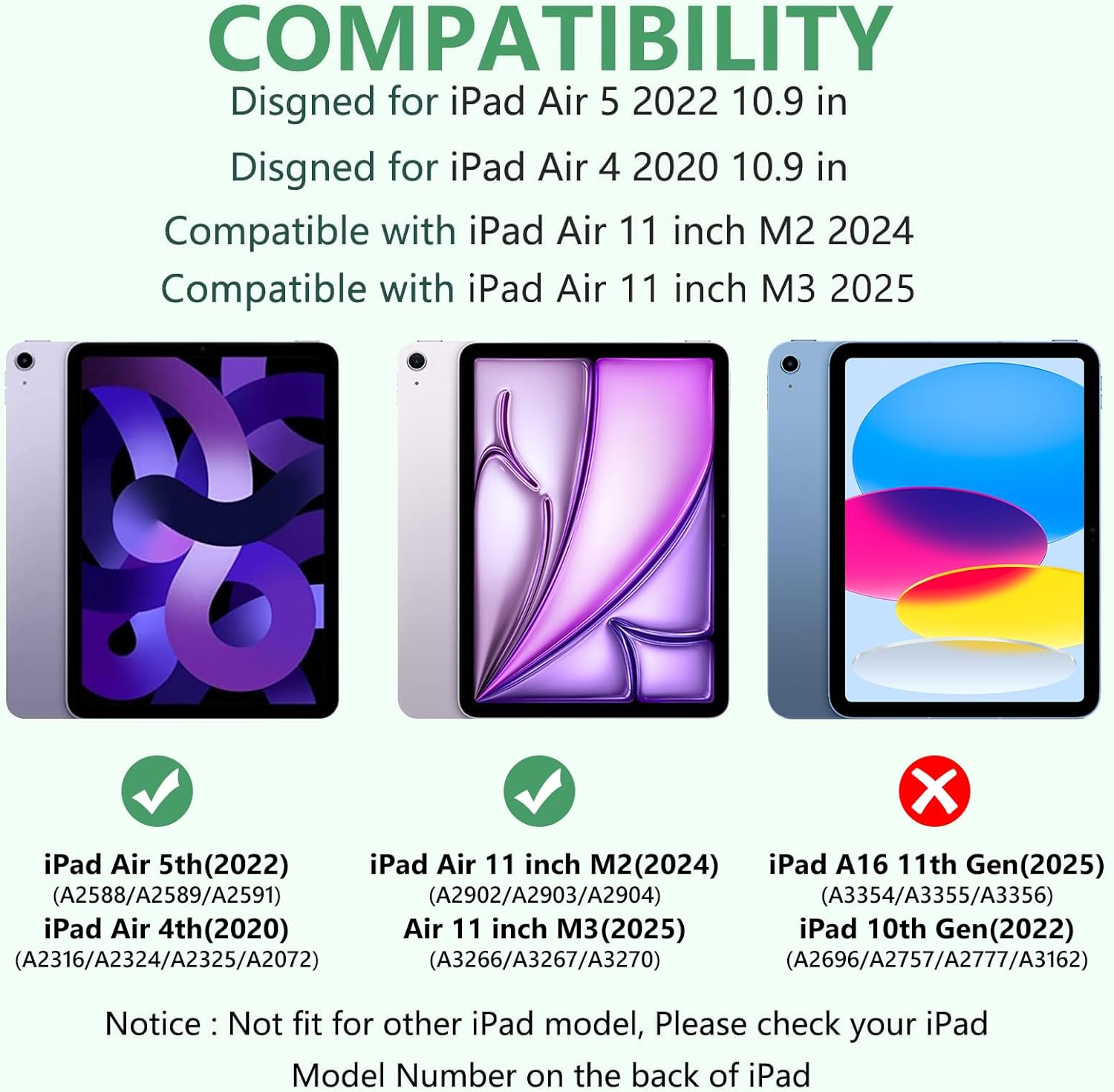 - For iPad Air 11 inch Case with Keyboard: This for ipad air keyboard case compatible with iPad Air 11-inch M3 2025 (A3266/A3267/A3270), compatible with iPad Air 11-inch M2 2024 (A2902/A2903/A2904), compatible with iPad Air 5th Generation 10.9 inch 2022 (A2588/A2589/A2591), compatible with iPad Air 4th Generation 2020 ( A2072/A2316/A2324/A2325 ), compatible with iPad Pro 11 inch 1st Generation 2018 (A1980/A2013/A1934). ( Please kindly check the model number on the back of iPad before purchasing.)