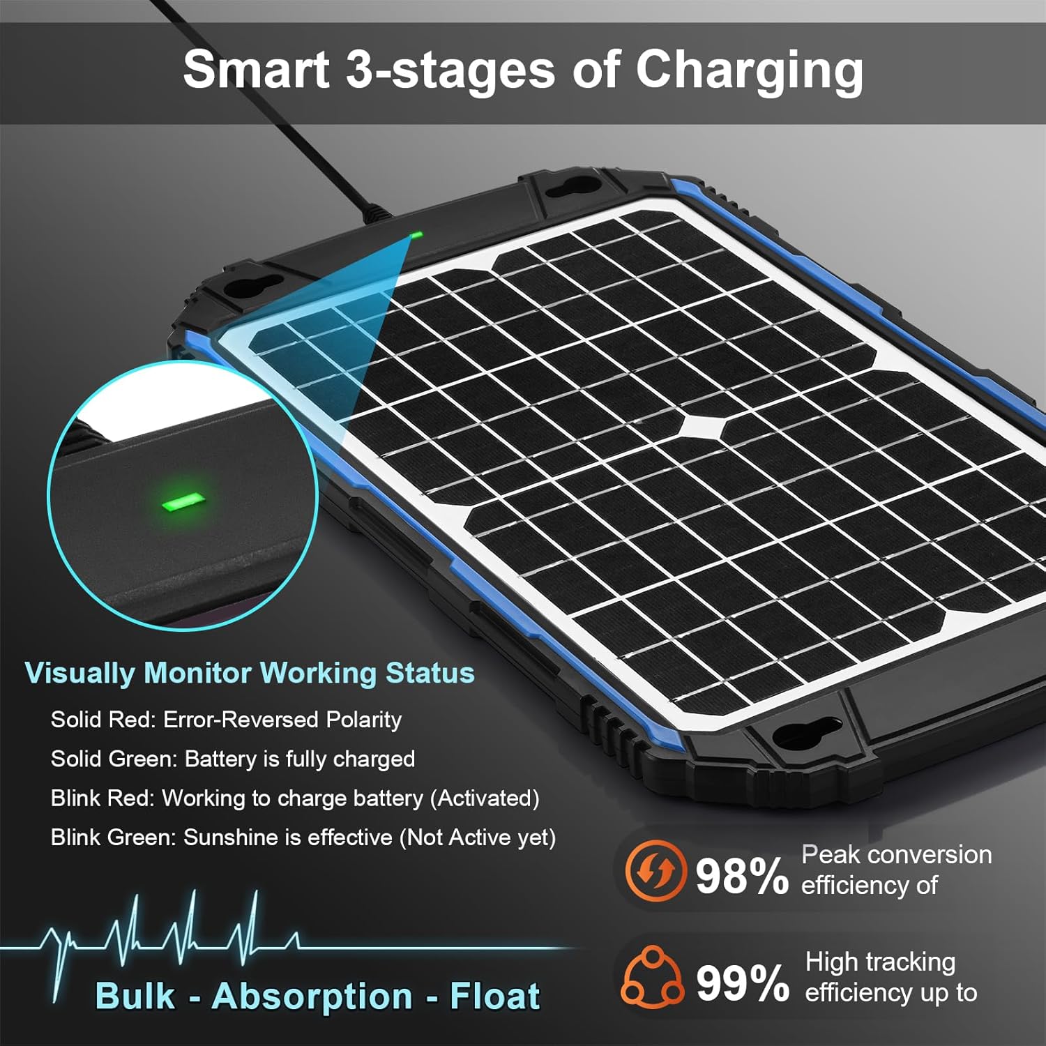 - 【Wide Compatibility】It's not just a solar powered battery charger, it's an advanced solar battery maintainer for 12-volt sealed lead-acid car, automotive, marine, RV, power sport, boat, dump trailer, motorcycle, trolling motor, tractor, ATV and deep-cycle batteries, including flooded, gel, AGM, SLA and maintenance-free, plus lifepo4 lithium batteries
